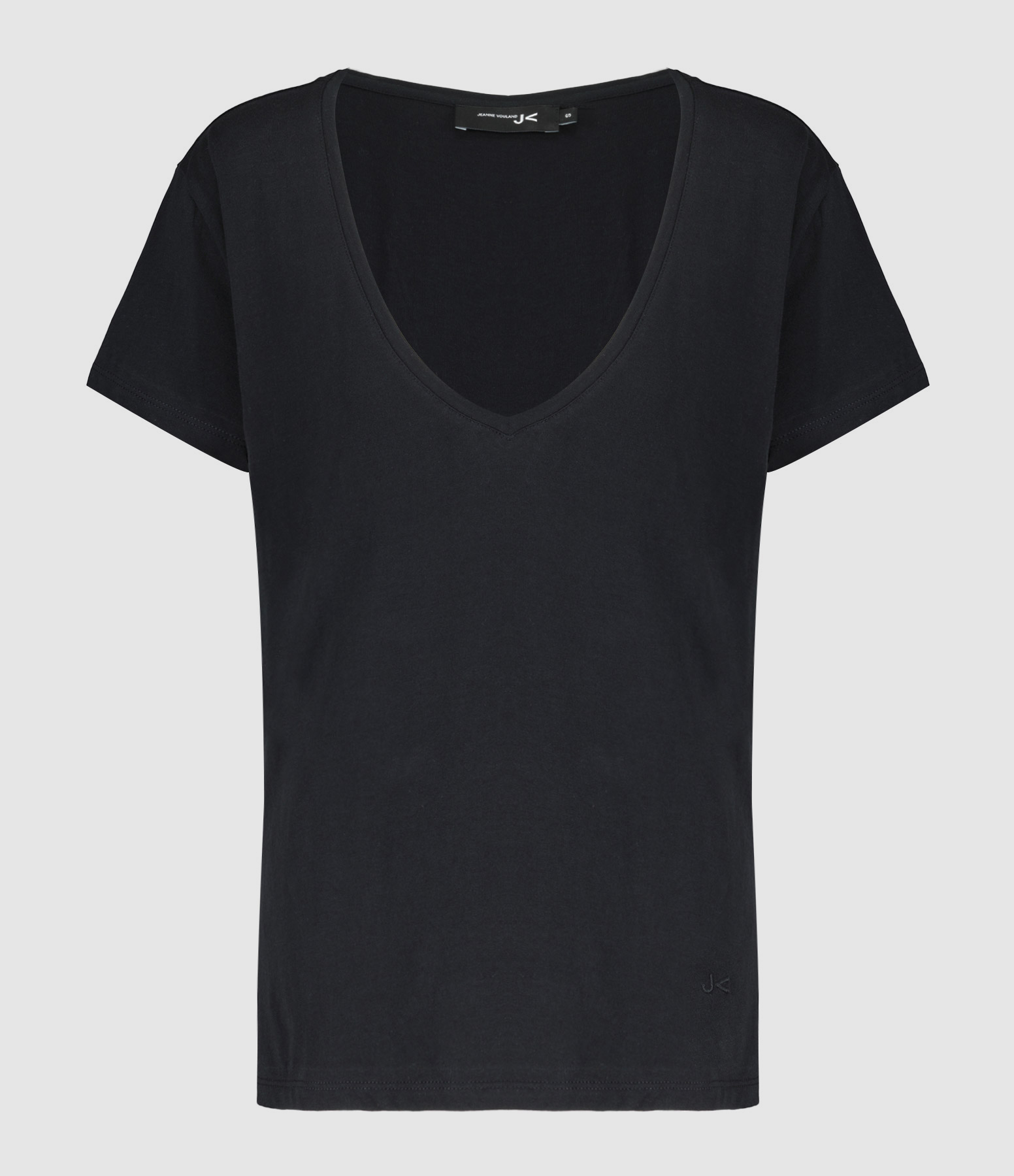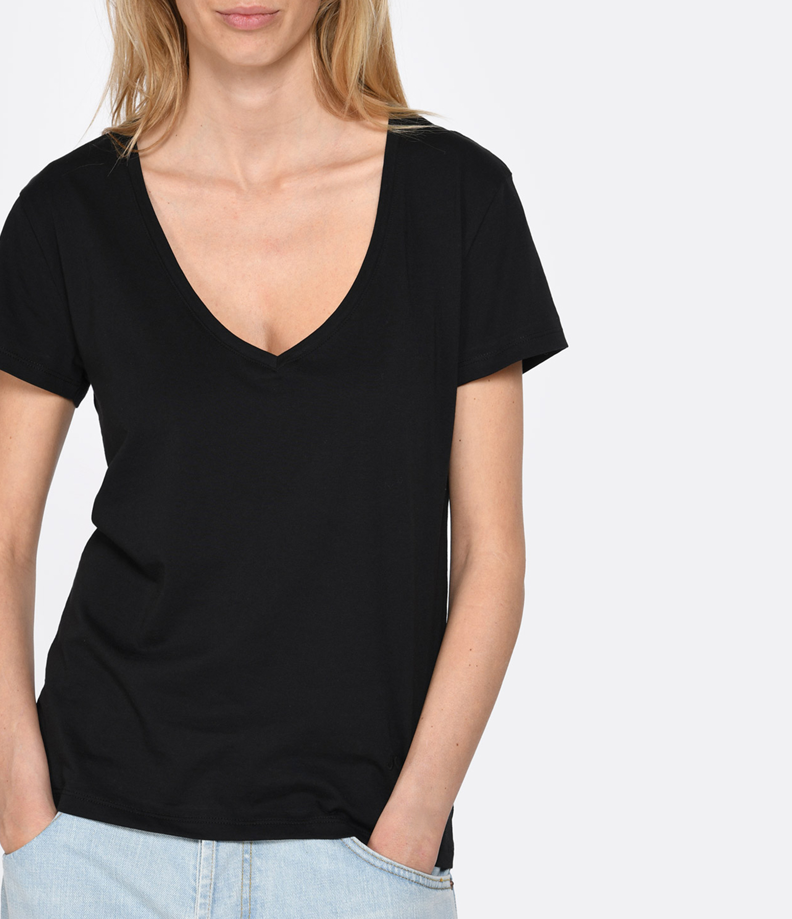 Tee-shirt en coton pima noir. Col V. Manches courtes. Coupe droite. Base droite.