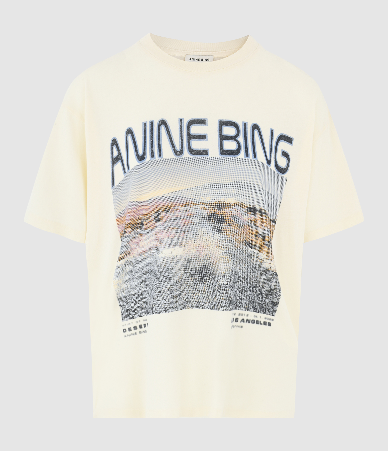 Tee-shirt manches courtes écru. Col rond côtelé et bords effet usés. Inscription "ANINE BING" bleu sur l'avant. Coupe carrée large et fluide, base droite.
