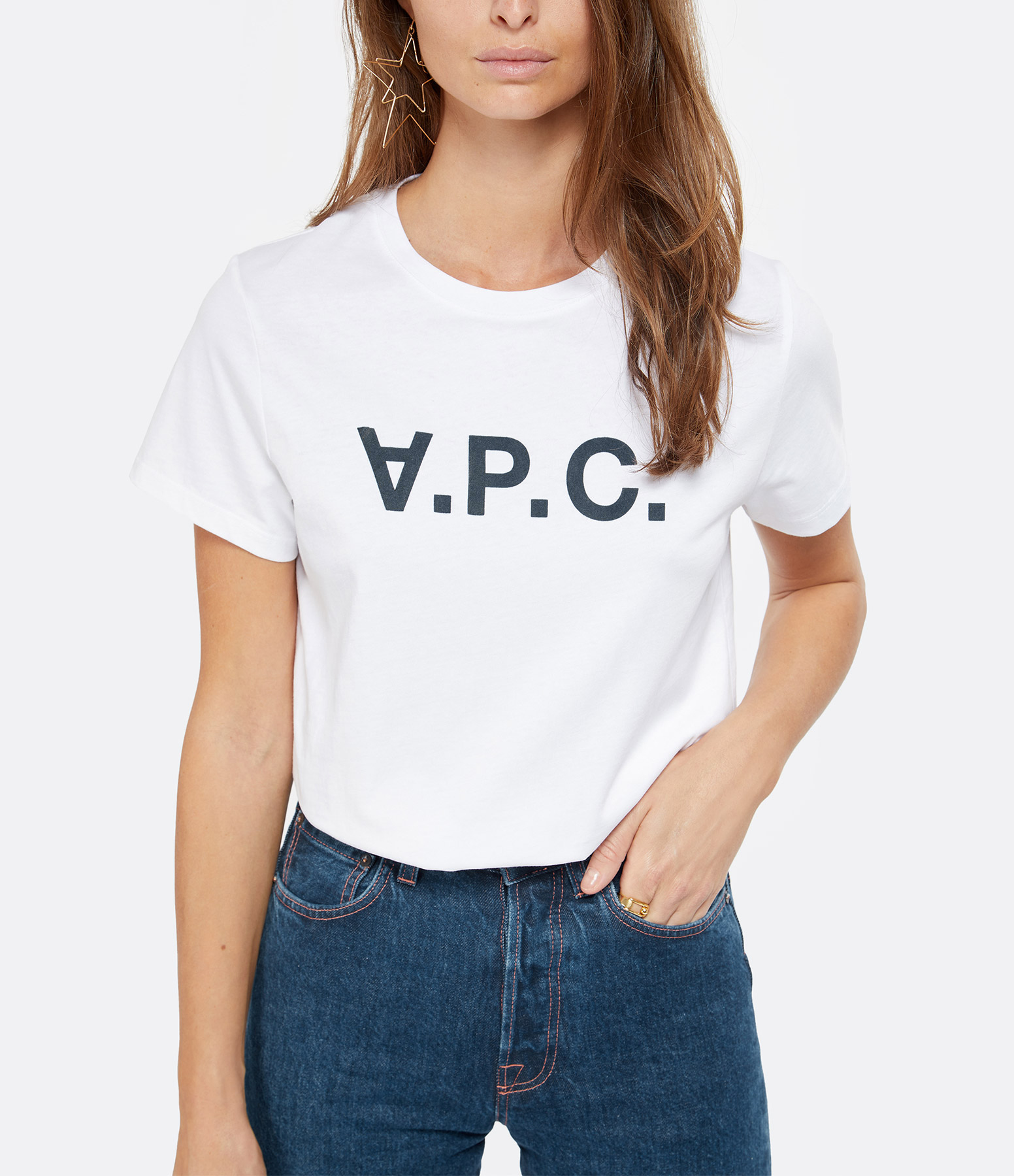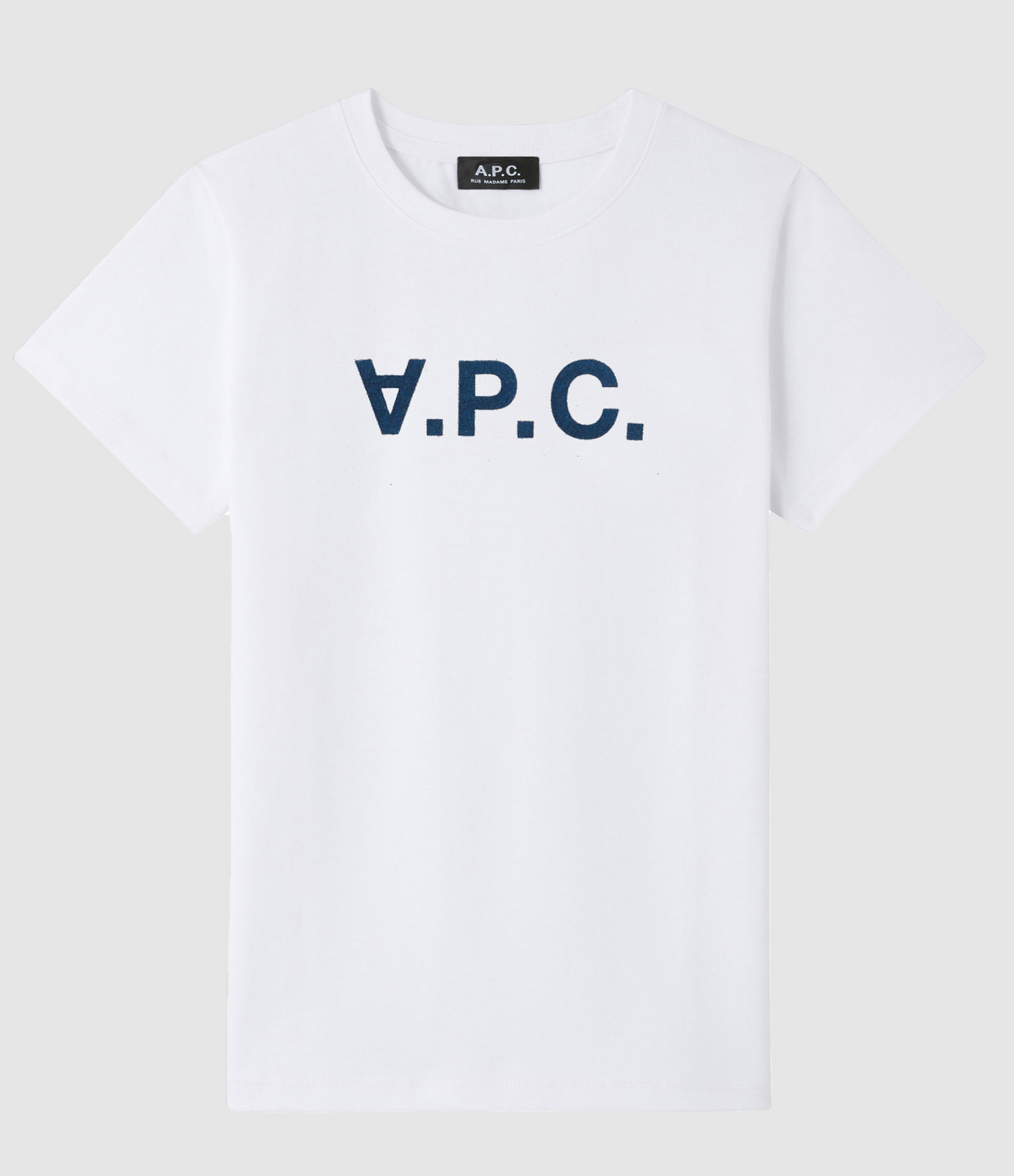 Tee-shirt en coton blanc. Inscription "A.P.C" en bleu marine à l'avant. Col rond. Manches courtes. Coupe droite. Base droite.