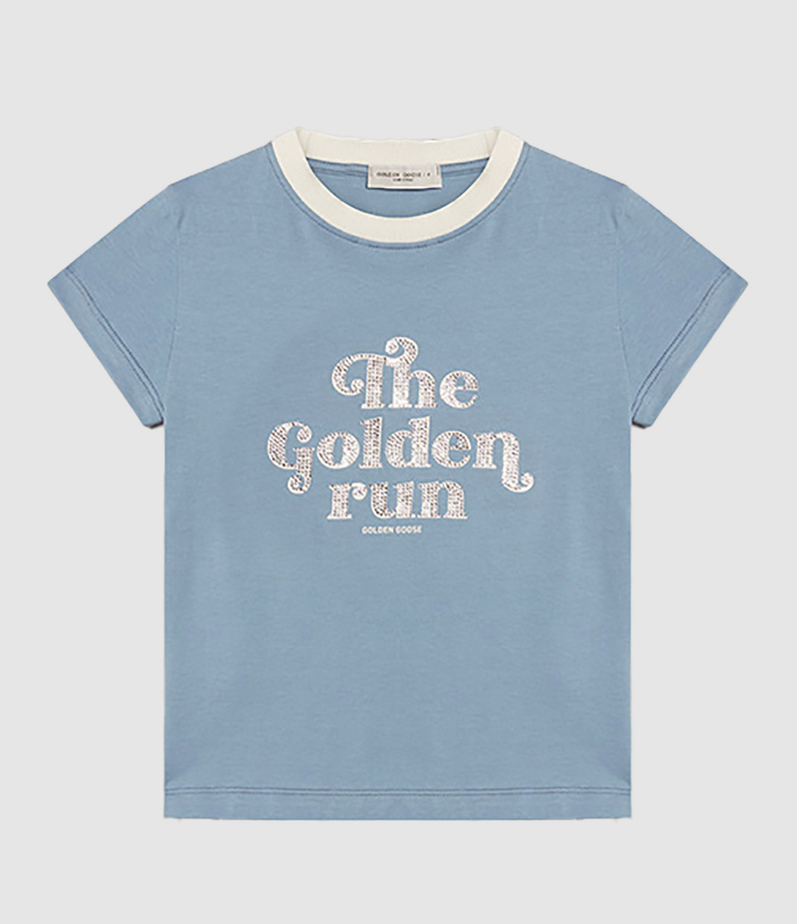 Tee shirt enfant en coton bleu. Imprimé "The Golden Run" blanc strassé sur la poitrine. Col rond blanc. Manches courtes. Coupe droite. Base droite.