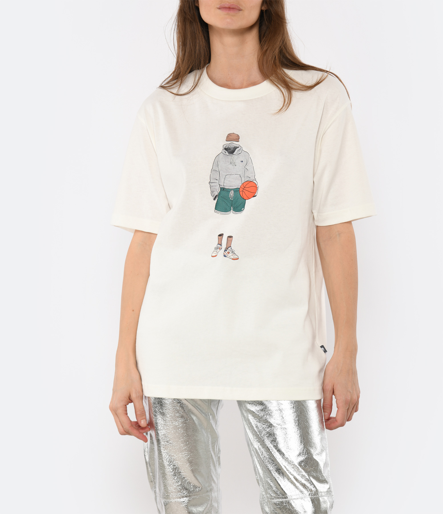 Tee shirt en coton blanc. Silhouette floquée à l'avant. Col rond côtelé. Manches courtes. Coupe droite. Base droite.