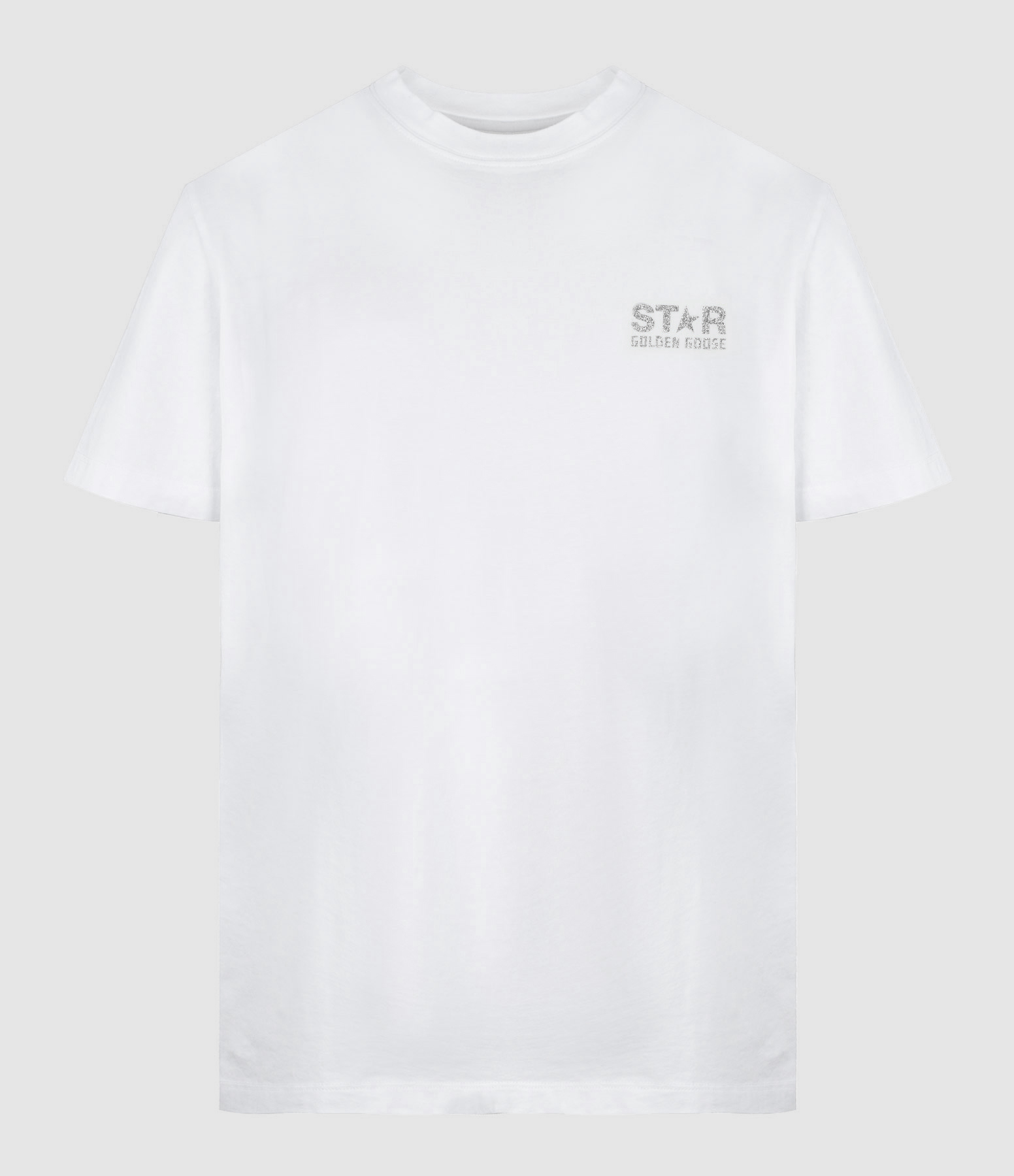 Tee-shirt en coton blanc avec inscription "STAR GOLDEN GOOSE" flockée paillette en argenté. Flockage paillette étoile argenté dans le dos. Col rond. Manches courtes. Coupe droite. Base droite. Non doublé.