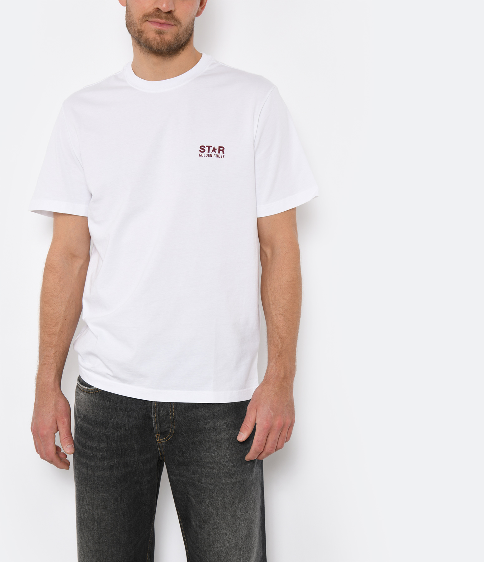 Tee-shirt en coton blanc. Inscription poitrine violine "STAR GOLDEN GOOSE" sérigraphiée. Logo étoile violine sérigraphié au dos. Col rond côtelé. Manches courtes. Coupe droite. Base droite. Non doublé.