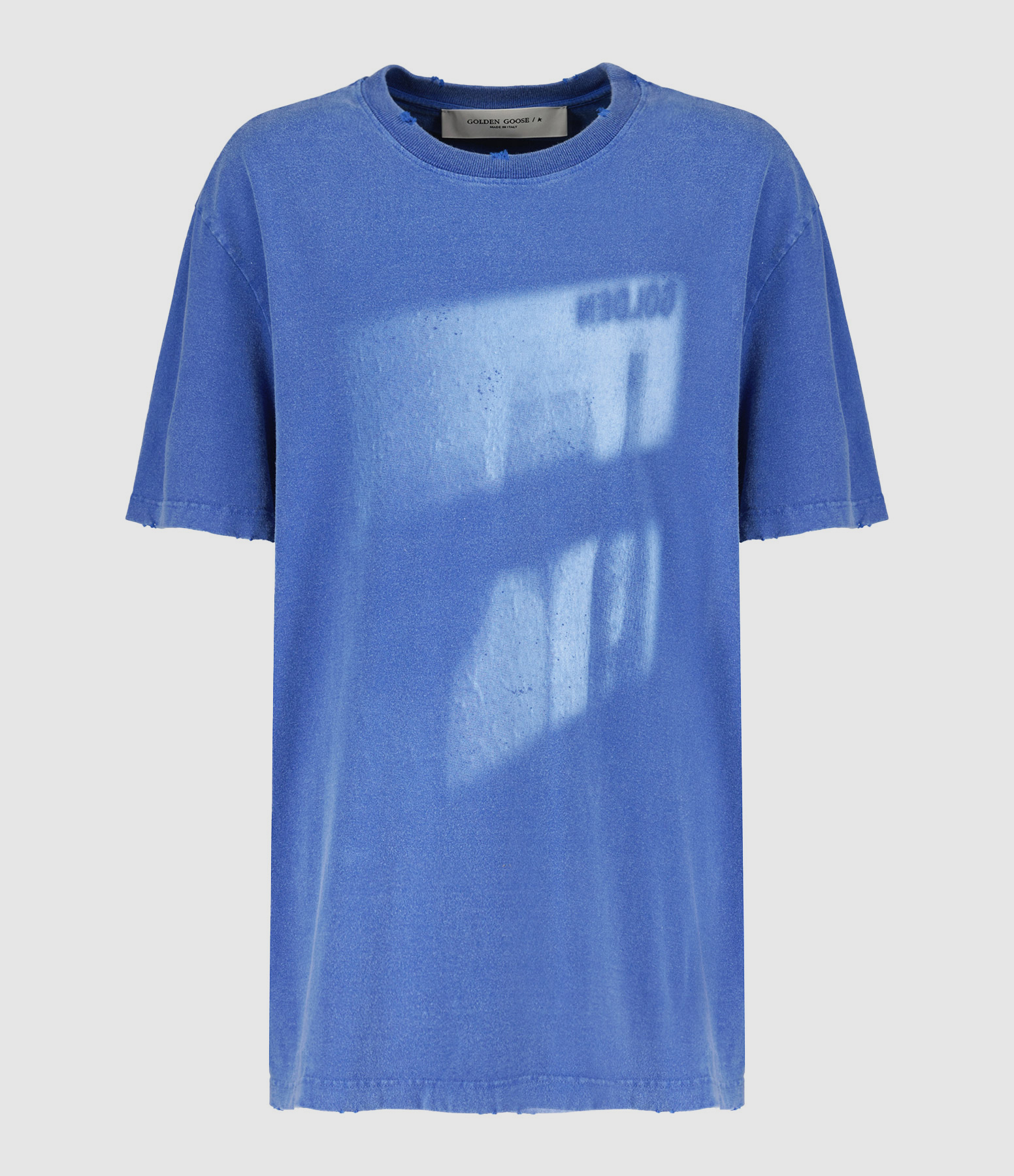 Tee-shirt en coton bleu délavé. Col rond. Coupe droite. Base droite. Effet usé volontairement.