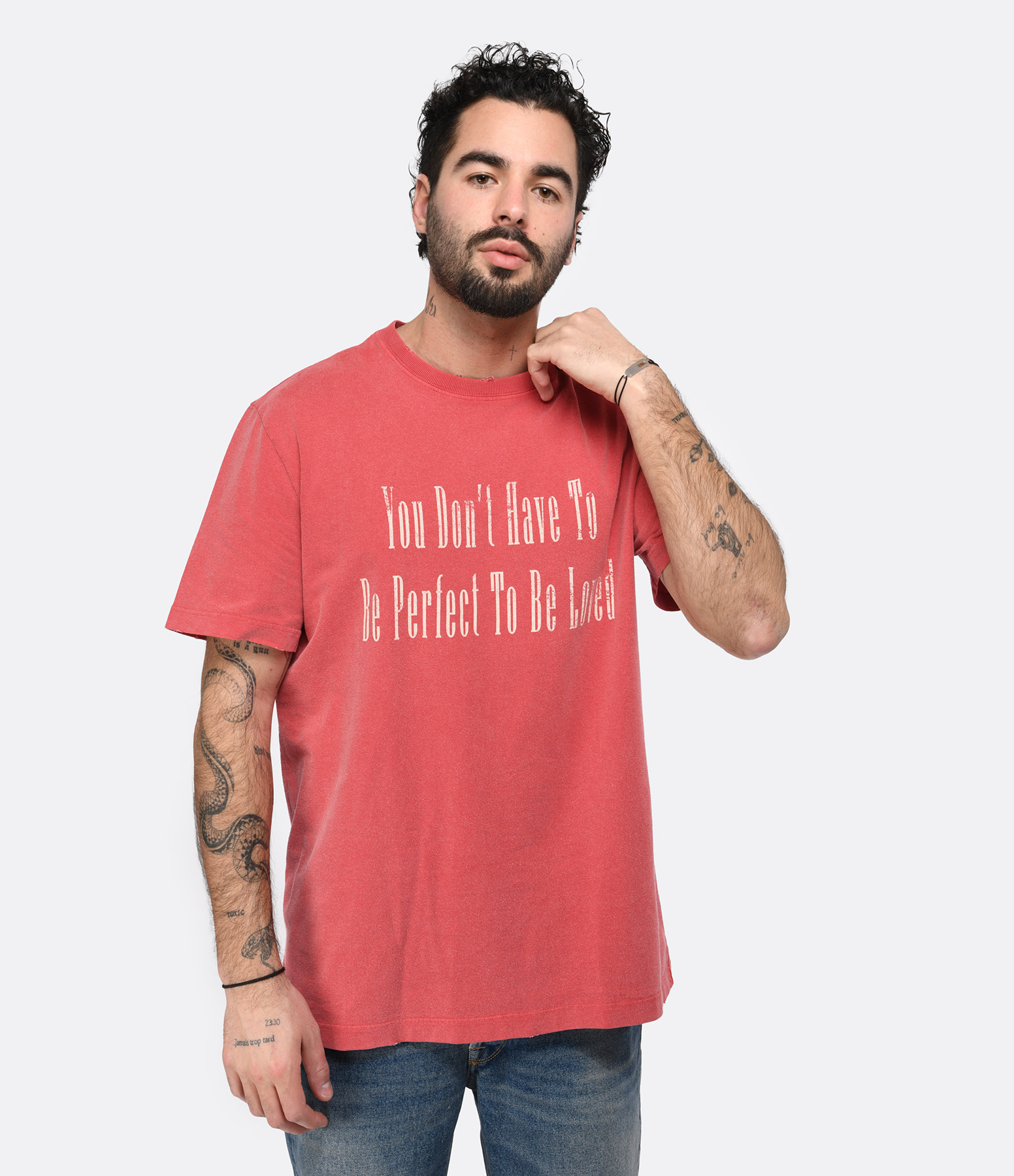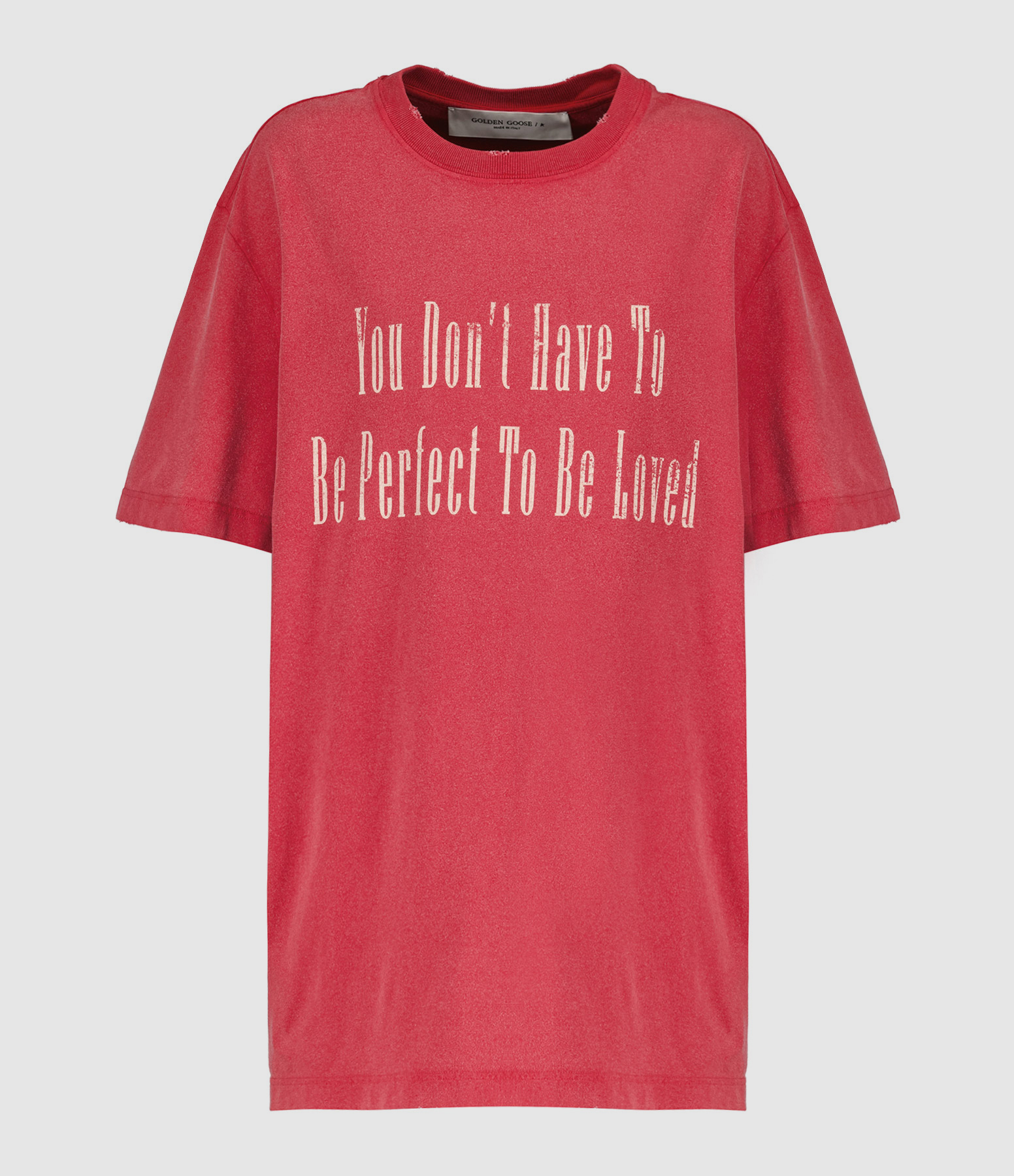 Tee-shirt en coton rouge avec l'inscription "You Don't Have To Be Perfect To Be Loved" imprimée en beige sur le devant. Col rond côtelé. Manches courtes. Double logo étoile en métal bronze dans la nuque. Coupe droite. Base droite. Effet usé et déchiré par endroits.