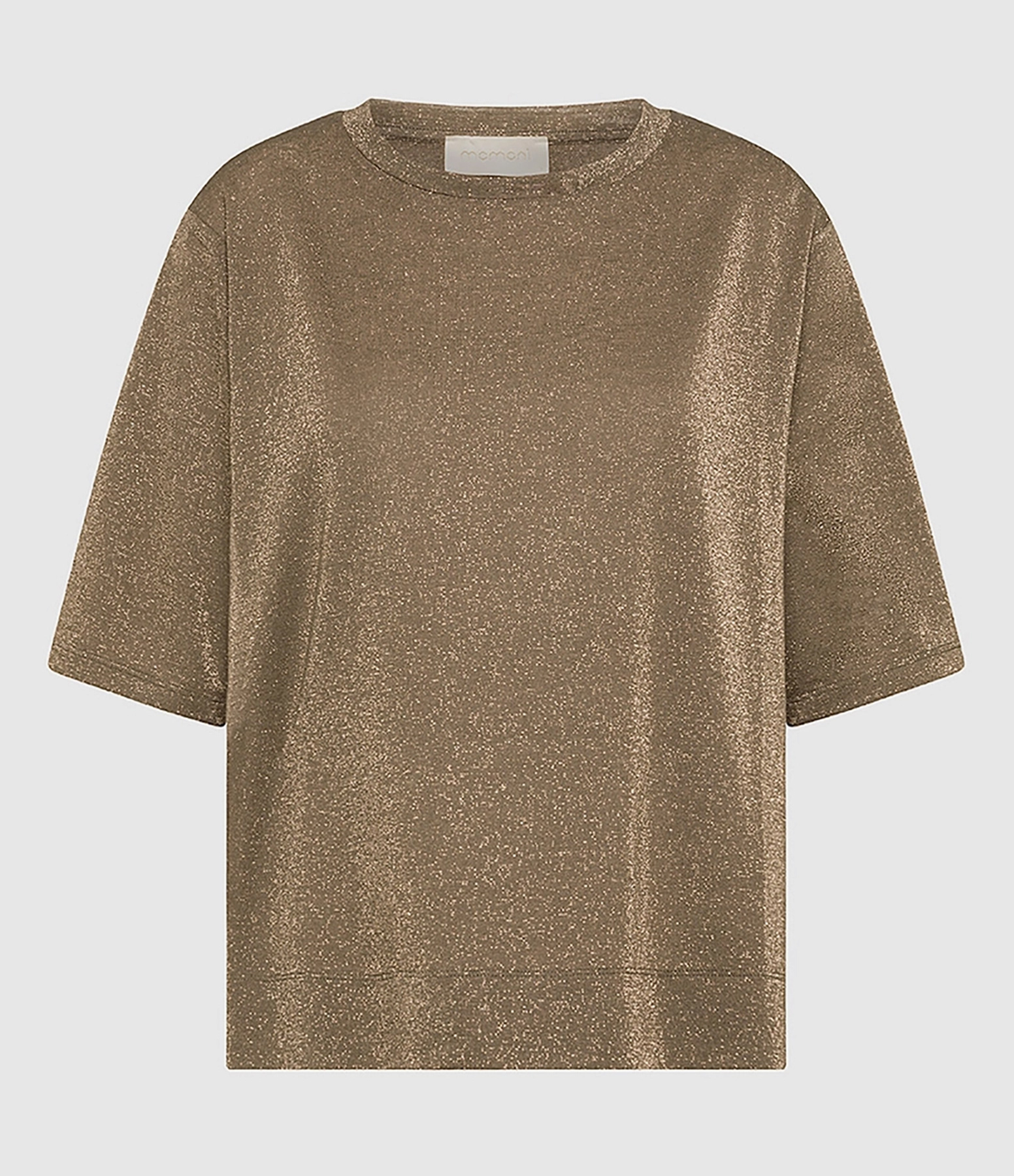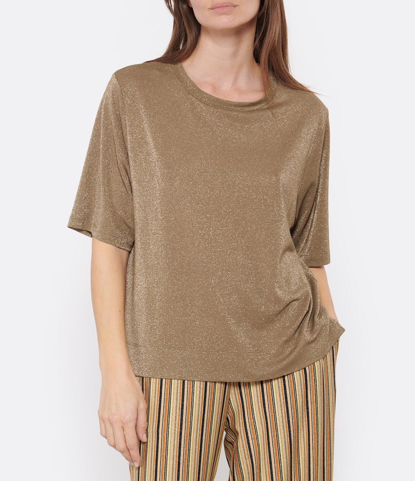 Tee shirt marron pailleté. Col bateau. Manches courtes. Coupe large. Base droite. Non doublé.