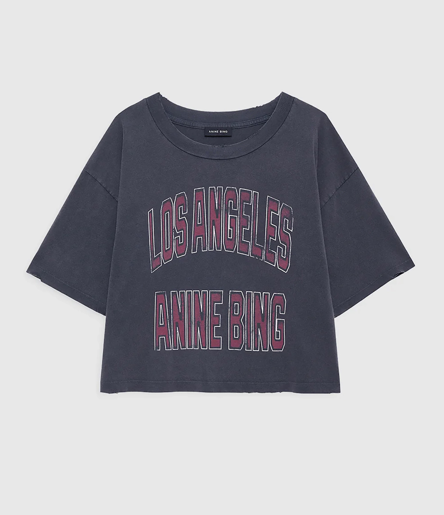 Tee-shirt court noir délavé à manches courtes, coupe ample. Logo bordeaux.