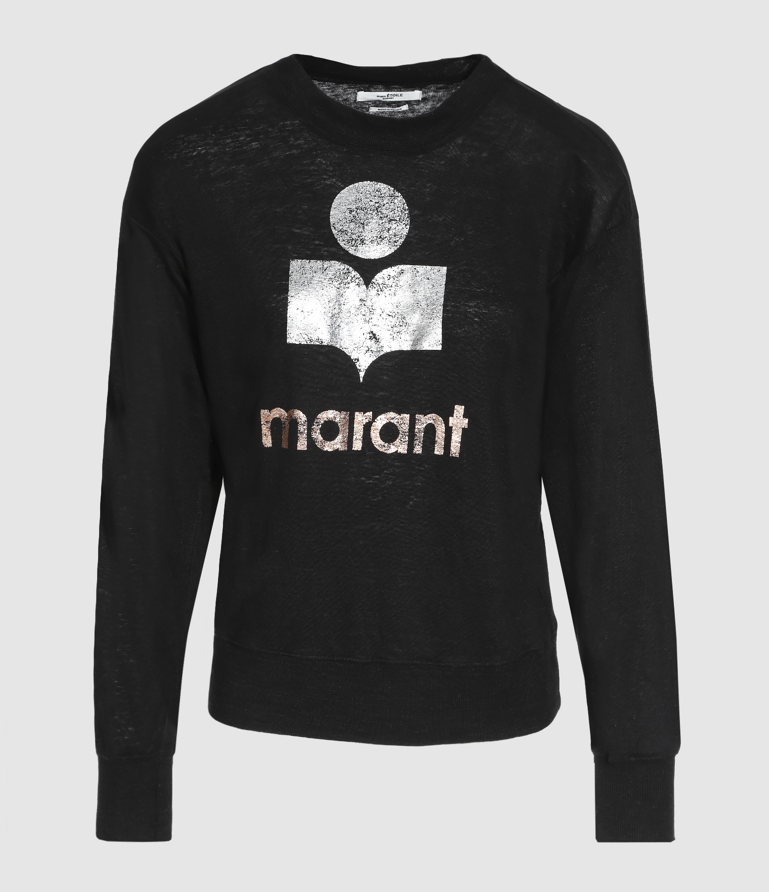 Tee-shirt en lin noir. Logo "Isabel Marant" argenté et rose gold floqué à l'avant. Col rond. Manches longues. Coupe droite. Base droite.