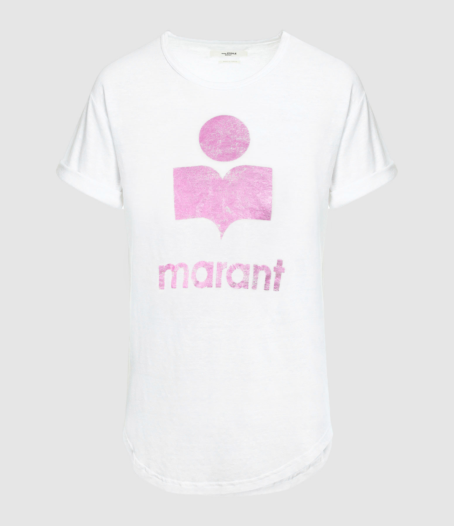 Tee-shirt en lin blanc avec le logo MARANT flocké en rose métallisé sur le devant. Col rond. Manches courtes. Coupe droite. Base arrondie.