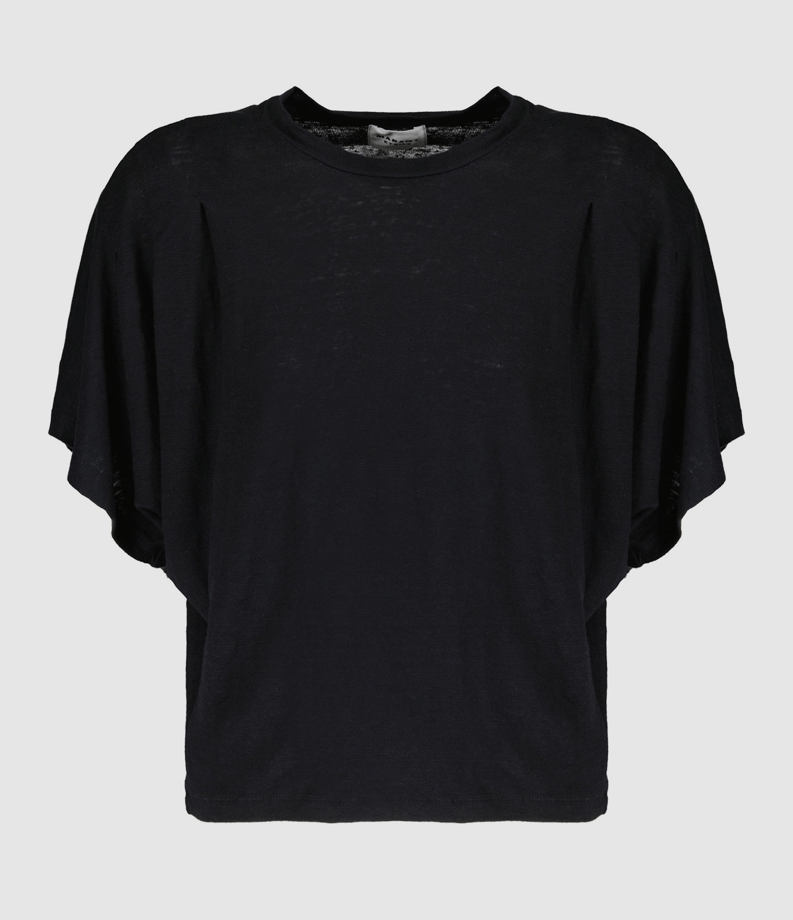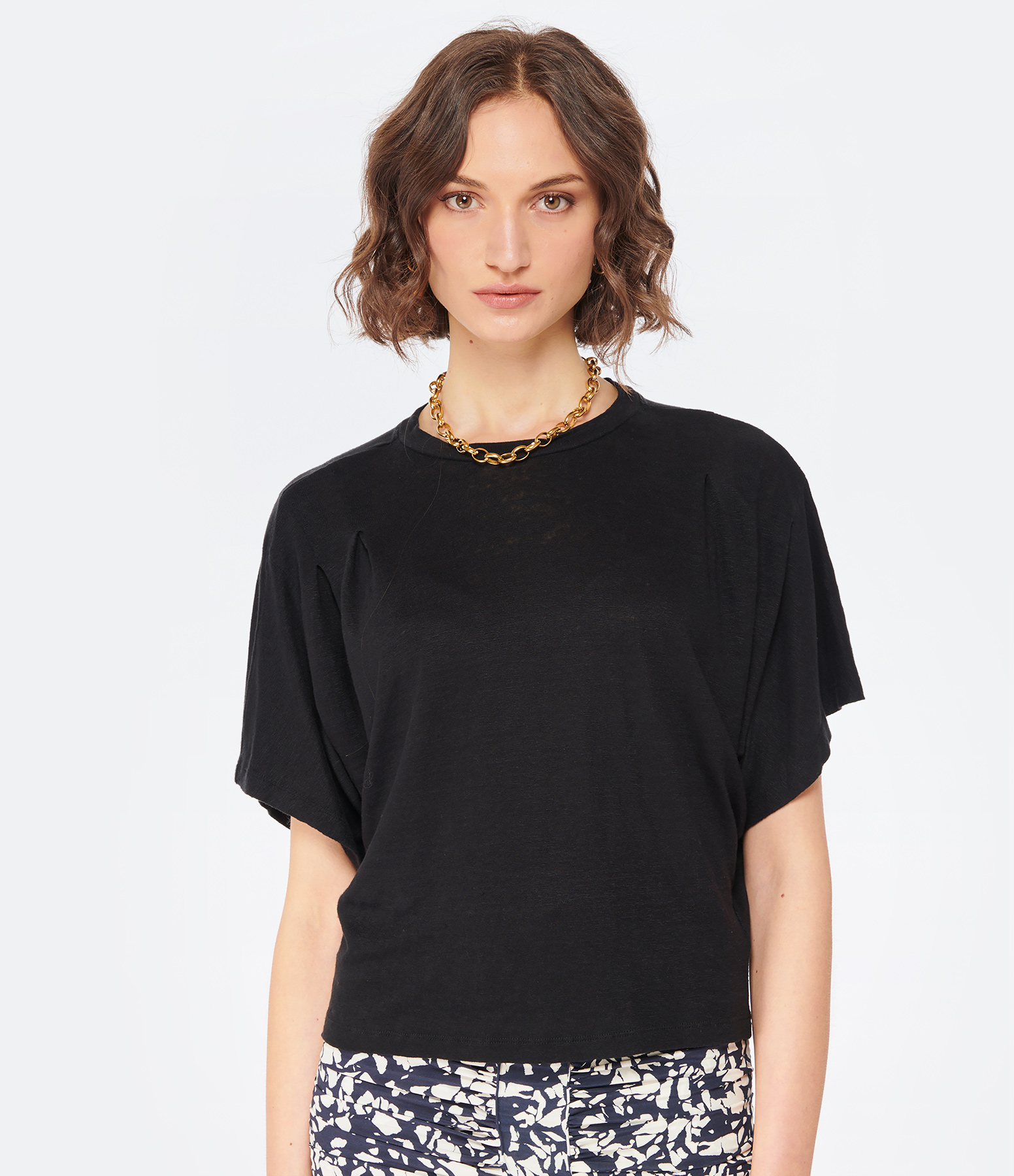 Tee-shirt en lin noir. Col rond côtelé. Épaules plissées. Manches courtes chauve-souris. Coupe ample. Base droite.