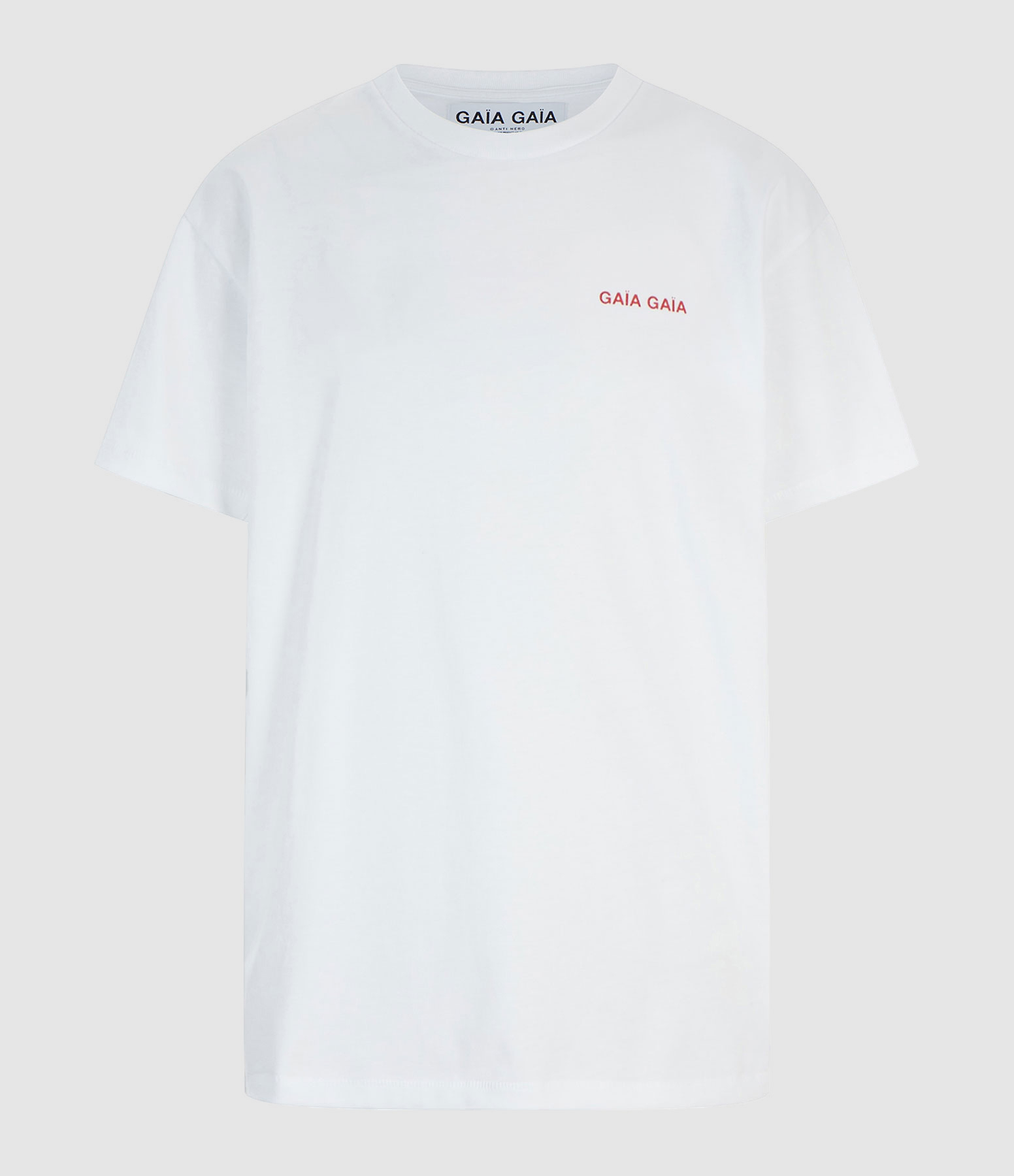 Tee-shirt en coton blanc. Inscription rouge "GAIA GAIA" floquée sur la poitrine. Manches courtes avec épaulettes. Col rond. Coupe droite. Base droite.