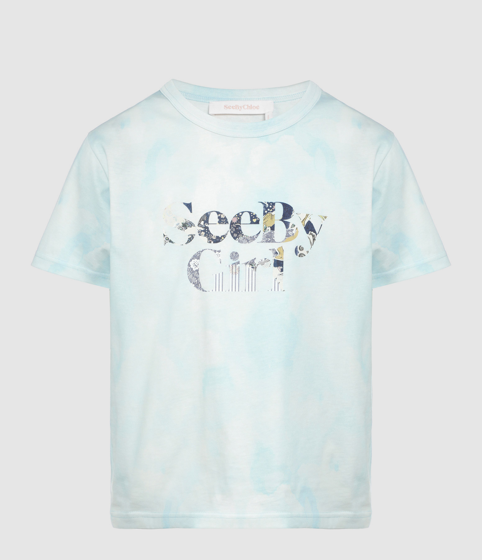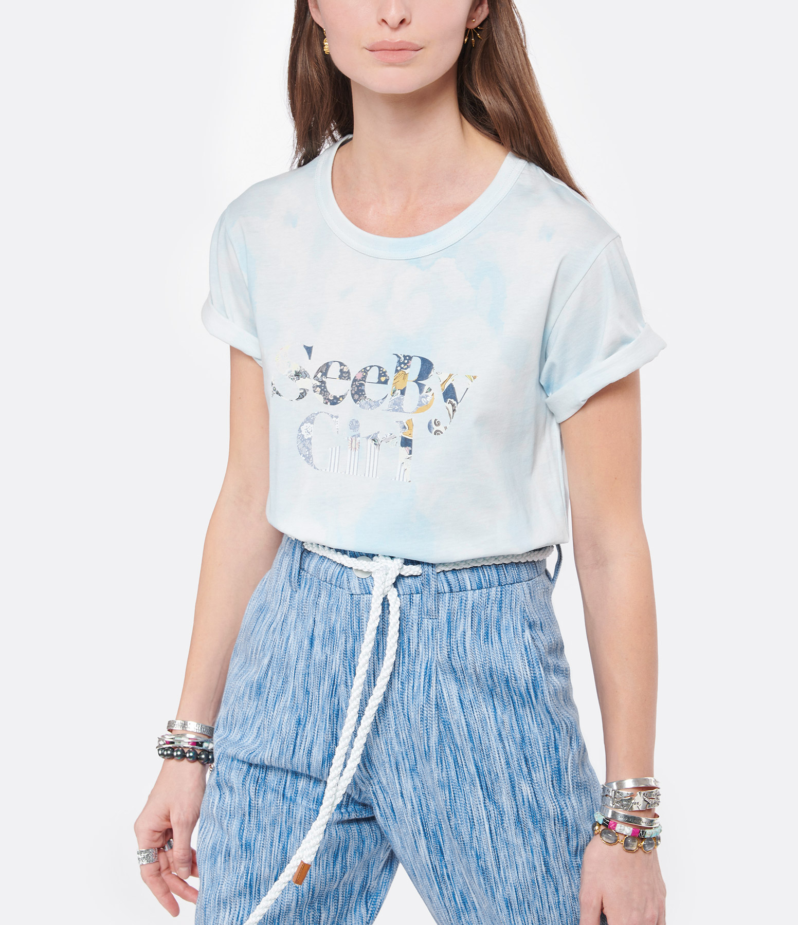 Tee-shirt en coton à imprimé bleu délavé avec inscription "SeeByGirl" multicolore floqué à l'avant. Col rond. Manches courtes. Coupe droite. Base droite.