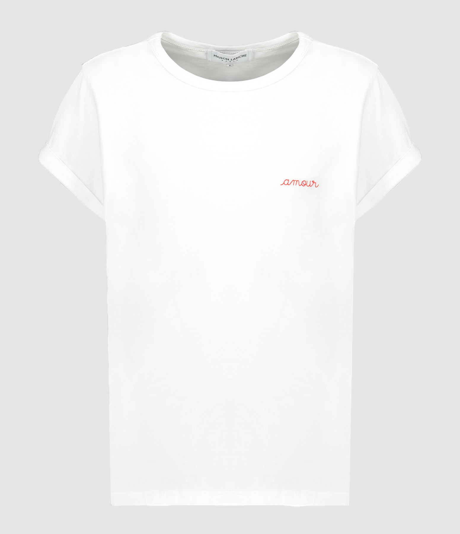 Tee-shirt à manches courtes en coton blanc. Inscription "Amour" brodée en rouge côté cœur. Col rond. Manches courtes. Coupe droite. Base droite.