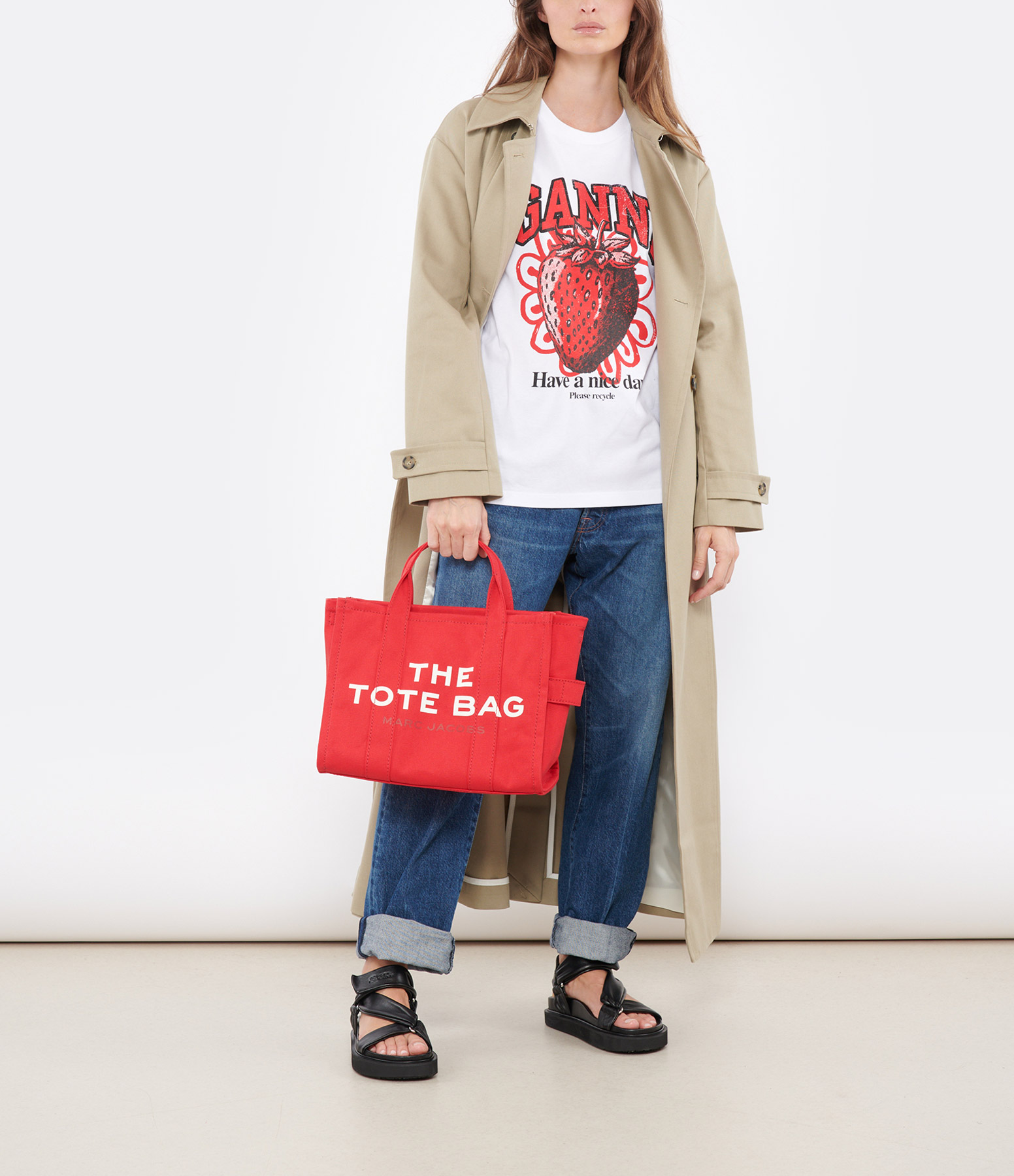 Tee-shirt de coton blanc. Un logo, une fraise et l'inscription "Have a nice day! Please recycle" en flocage rouge et noir. Col rond côtelé. Manches courtes. Coupe droite et ample. Base droite.
