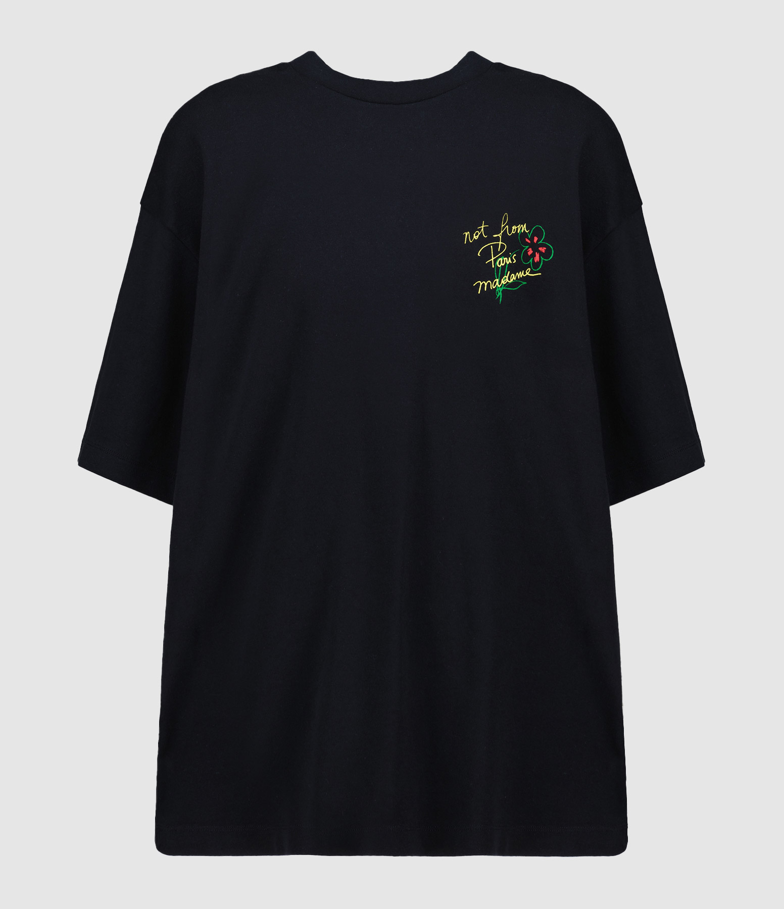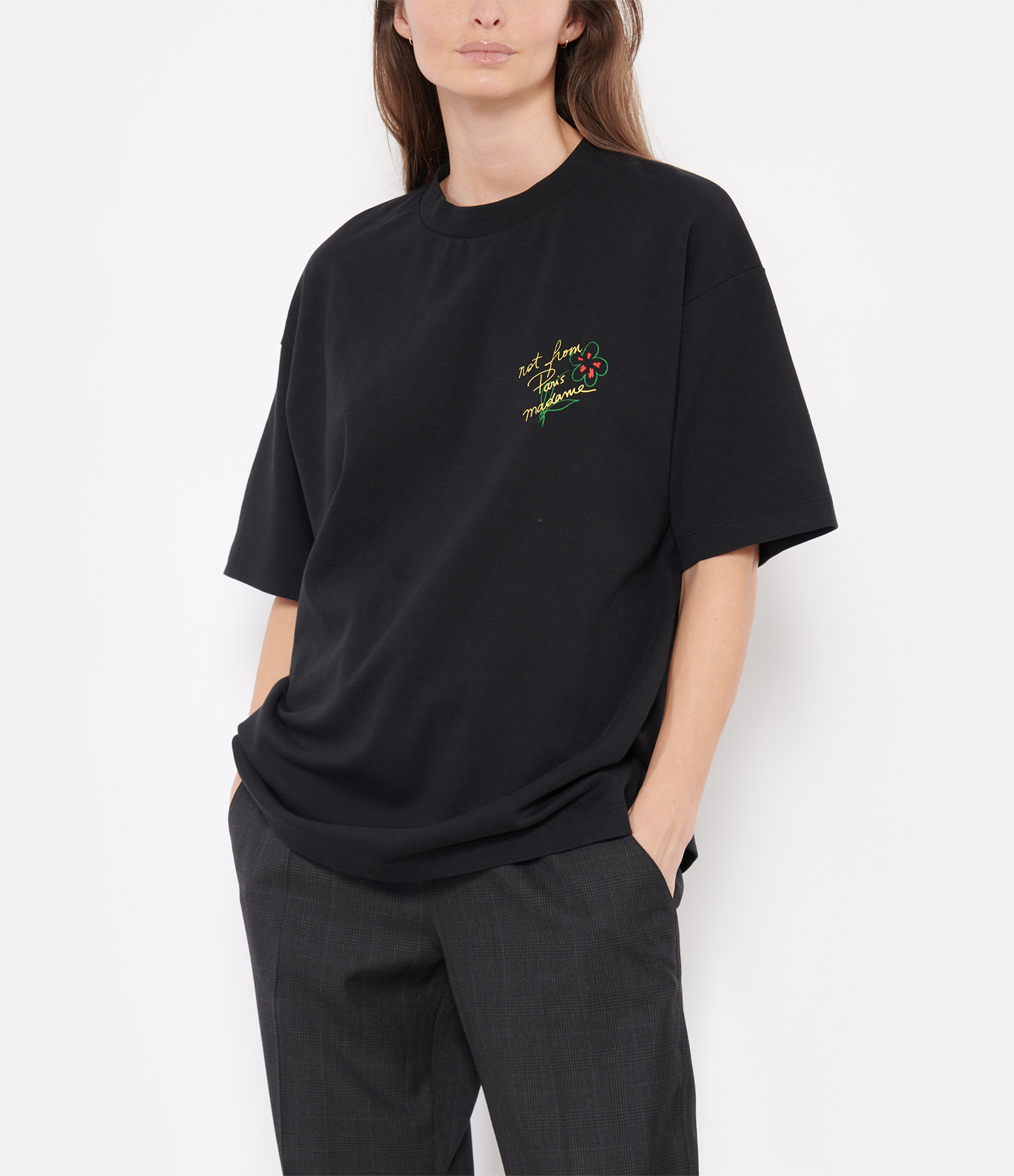 Tee-shirt unisexe en coton noir. Broderie "NOT FROM PARIS MADAME" avec fleur sur la poitrine et en plus grand dans le dos. Col rond. Manches courtes. Coupe large.
