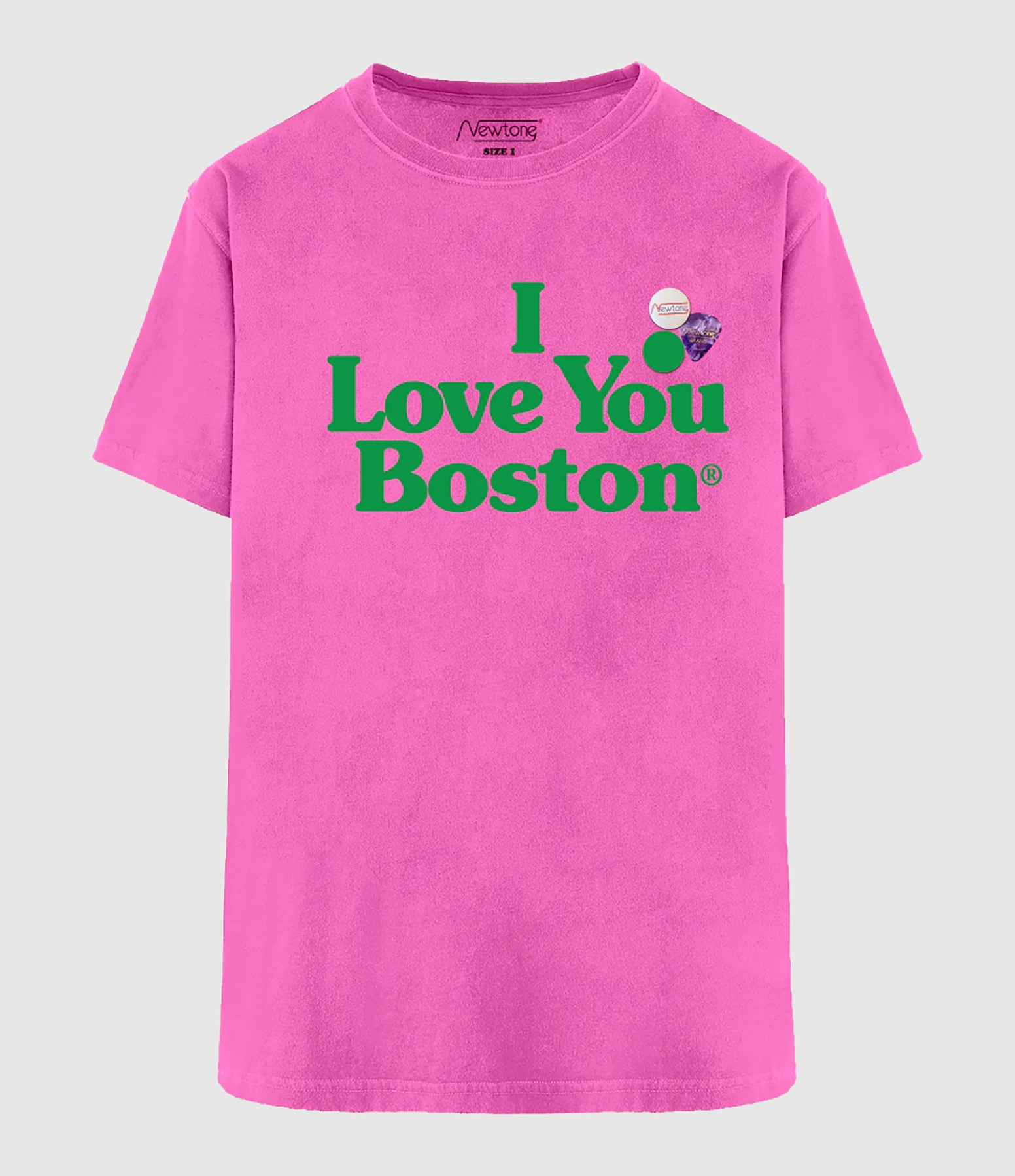 Tee-shirt en coton rose avec inscription "I love you Boston". 2 badges et un médiateur sur la poitrine. Col rond. Manches courtes. Coupe droite. Base droite.