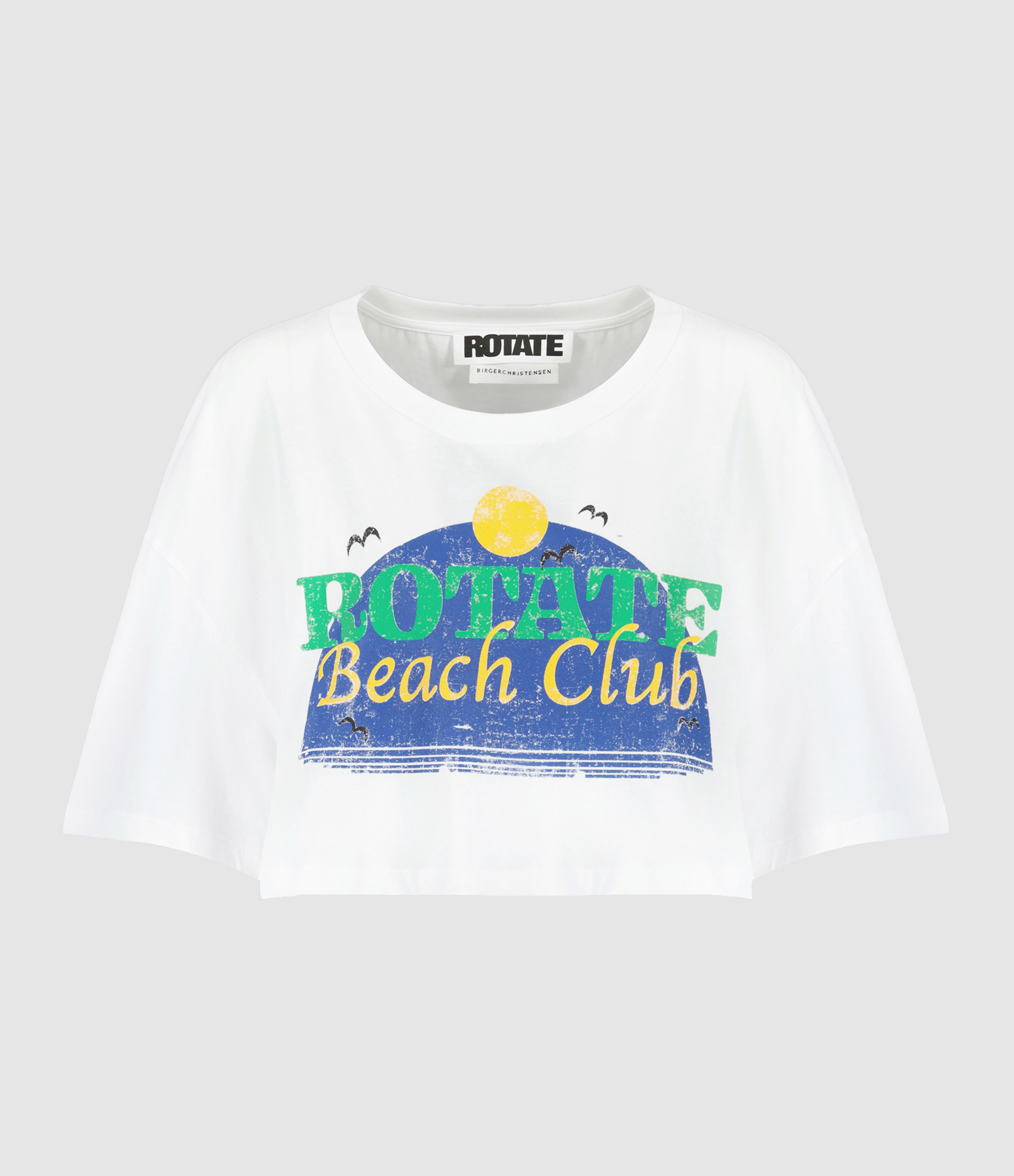 Tee-shirt court en coton blanc avec sérigraphie multicolore "Rotate Beach Club" floquée à l'avant. Col rond. Manches courtes. Coupe ample. Base droite.
