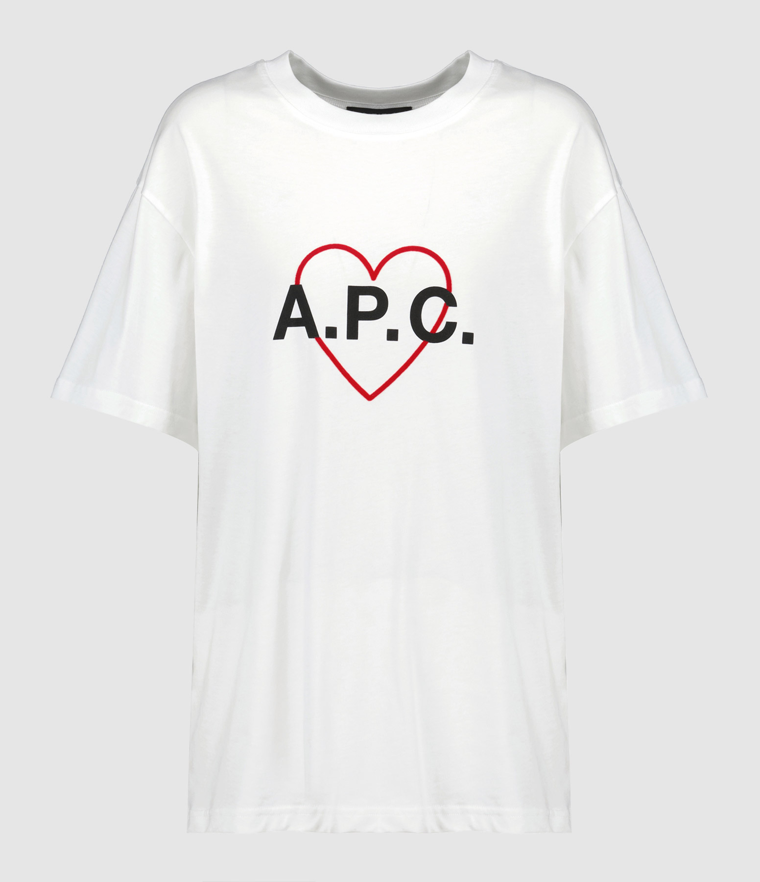Tee-shirt en coton blanc à manches courtes. Logo A.P.C. flocké en noir sur le devant dans un cœur rouge. Col rond. Coupe droite. Base droite.