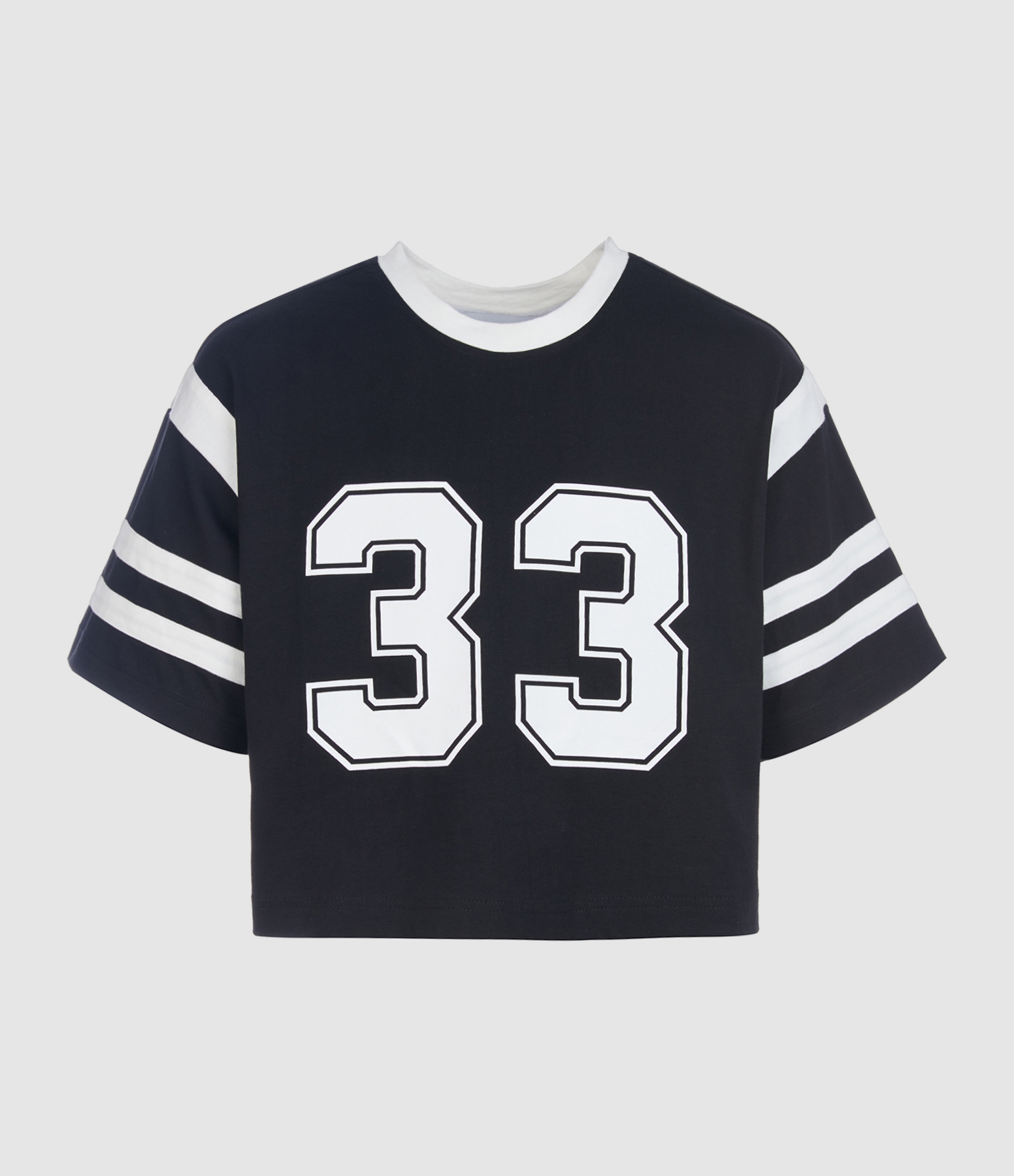 Tee-shirt court en coton noir, effet maillot de sport. Col rond contrasté. Manches courtes avec bandes blanches. Numéro "33" floqué à l'avant. Coupe ample. Base droite.