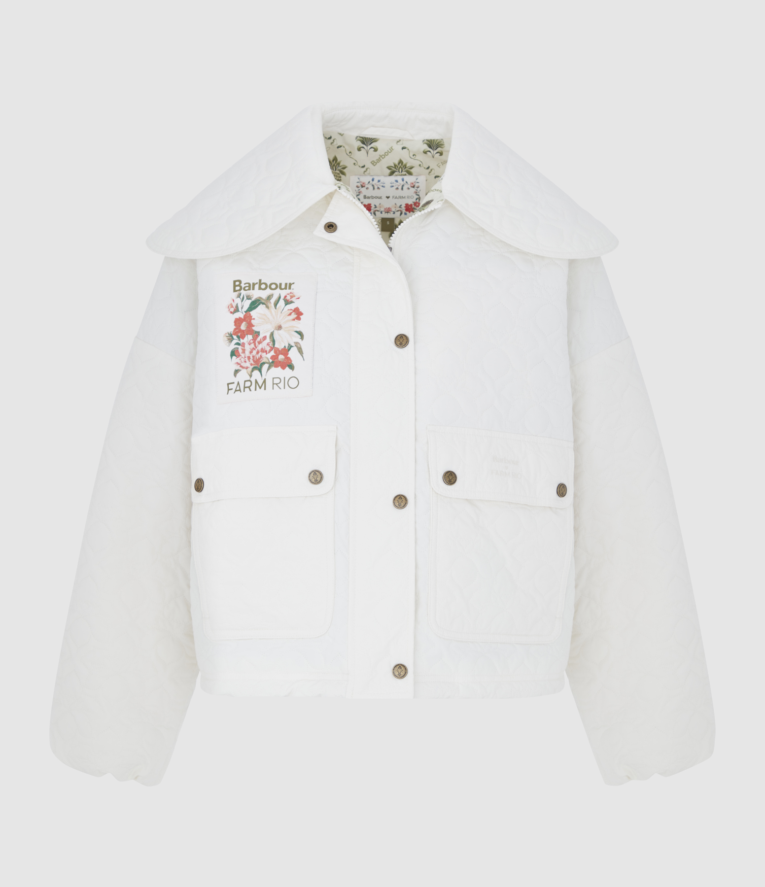 Tee-shirt blanc à la coupe longue. Doté d’un col rond classique. Il se distingue par son imprimé floral à l’avant, accompagné de l'inscription de la collaboration "FARM RIO", "Barbour".