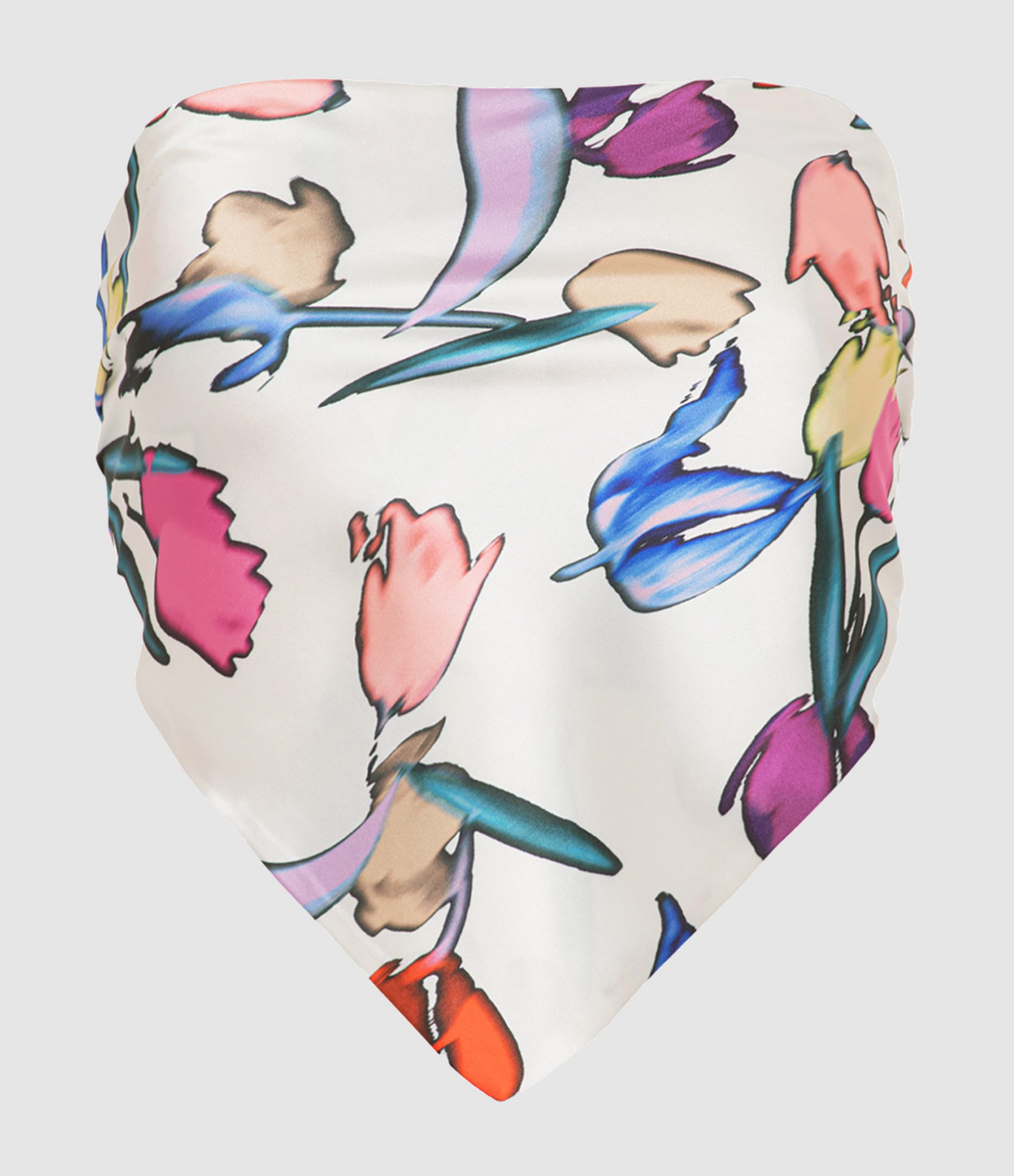 Top bustier "foulard bandana" en satin blanc imprimé fleuri. Encolure bandeau. Fermeture crochet logo "R" dans le dos. Coupe droite. Base triangulaire. Non doublé.