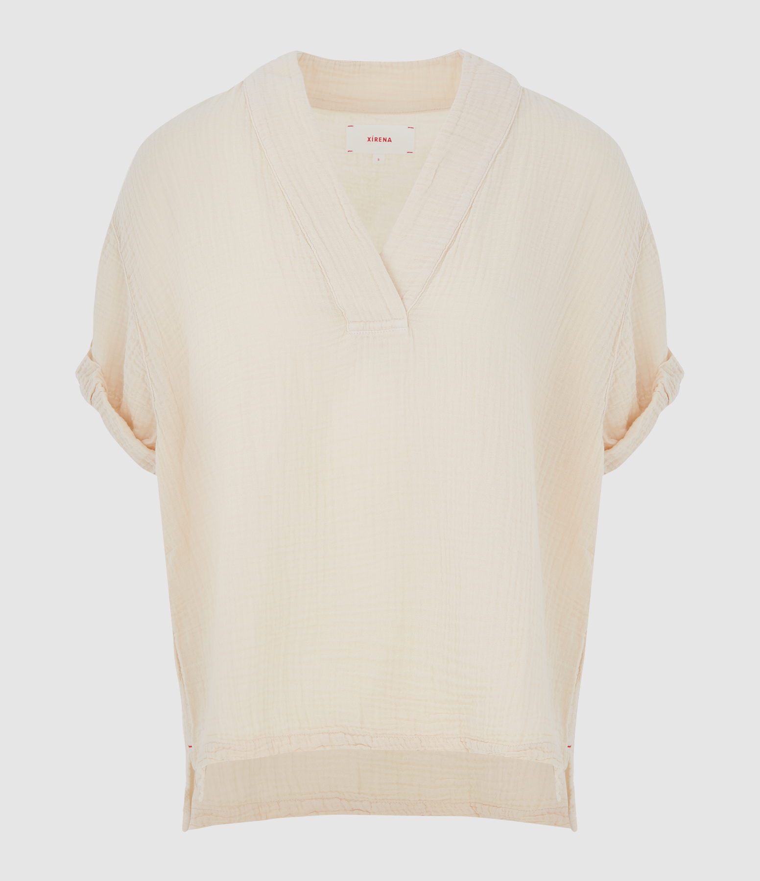 Top Avery, confectionné dans une gaze de coton et présente un aspect légèrement froissé. Léger et agréable à porter, il se distingue par un décolleté en V profond et des manches retroussées.