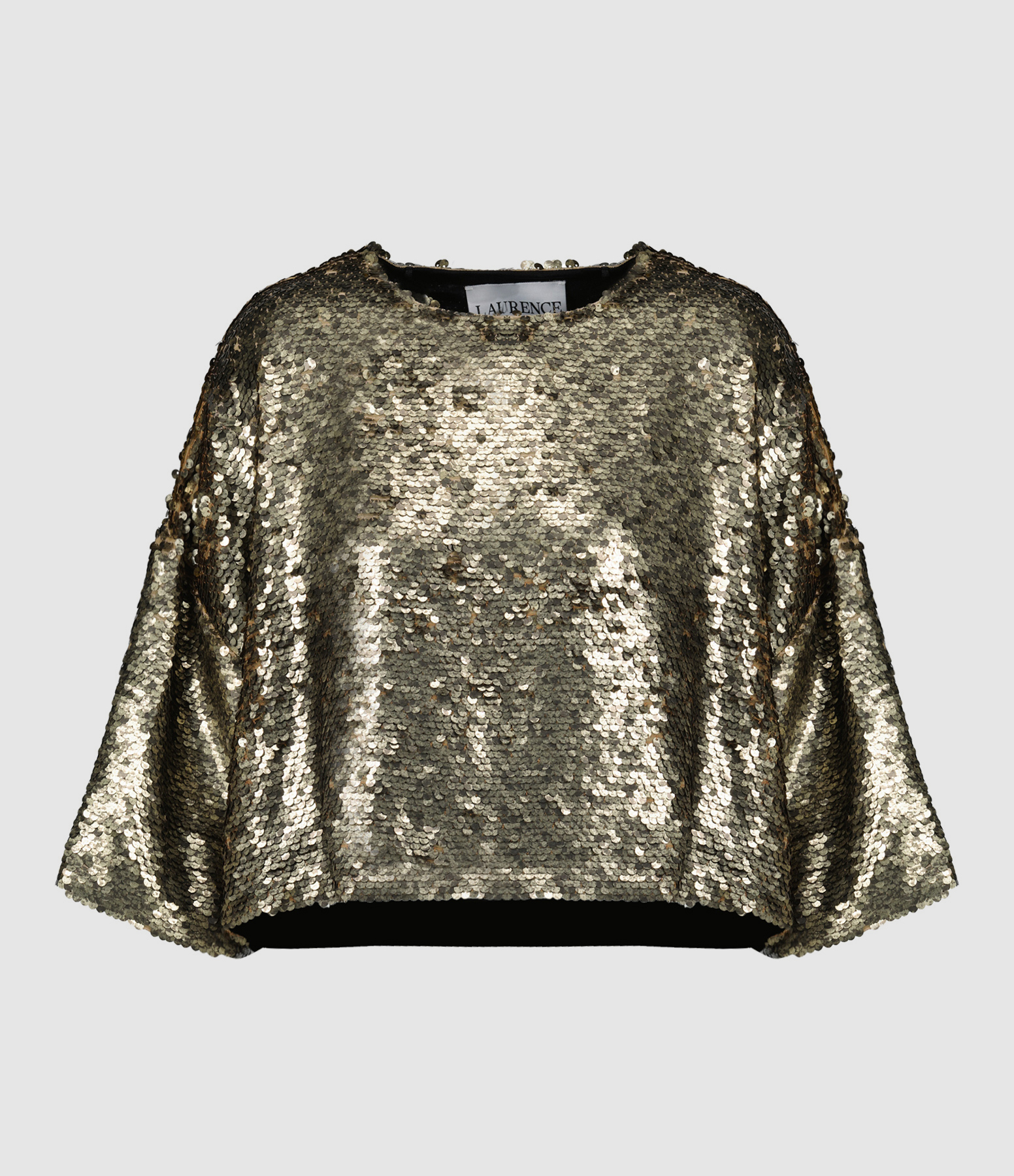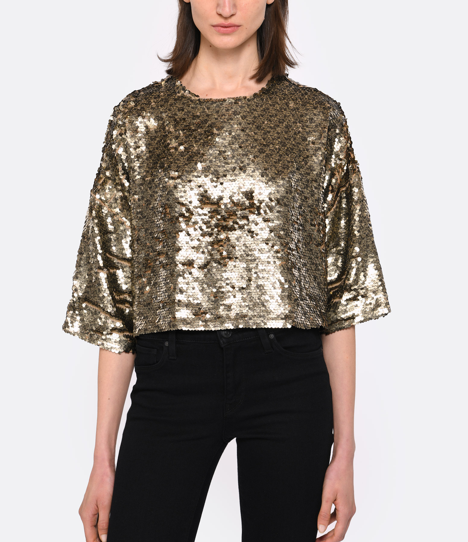 Top court à sequins dorés. Manches courtes. Col rond. Coupe droite. Base droite