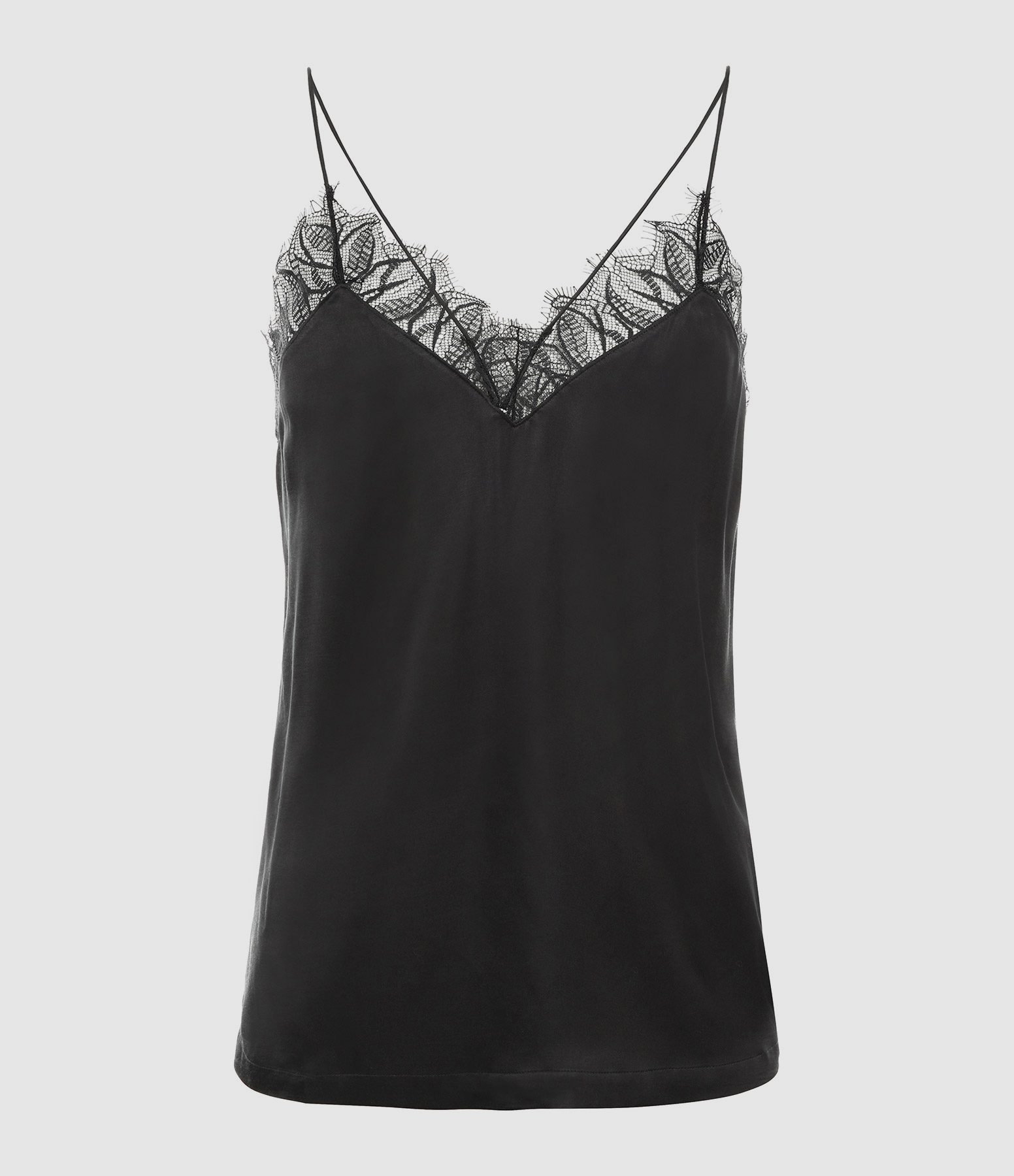 Débardeur à fines bretelles avec décolleté en dentelle, pour femme. Base droite. Coupe fluide. Non doublé.
