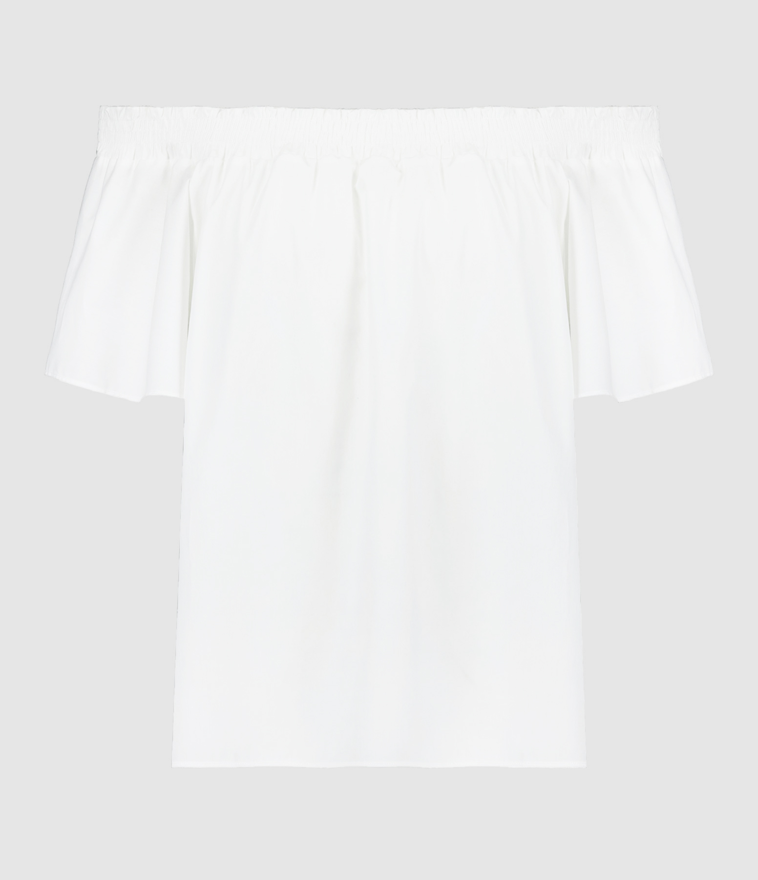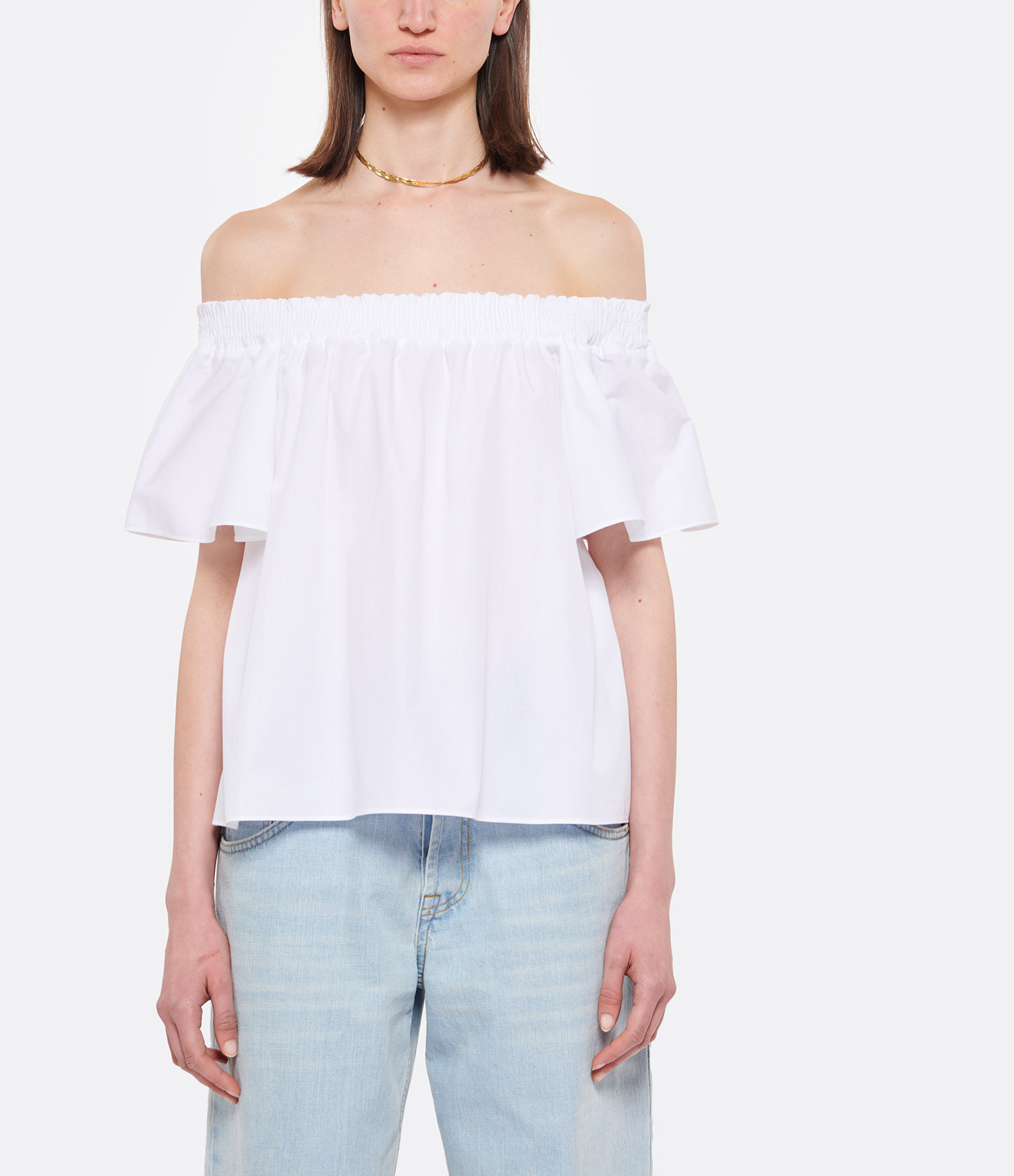 Top en popeline de coton blanc. Col bardot élastiqué. Manches courtes à volants. Coupe droite. Base droite.