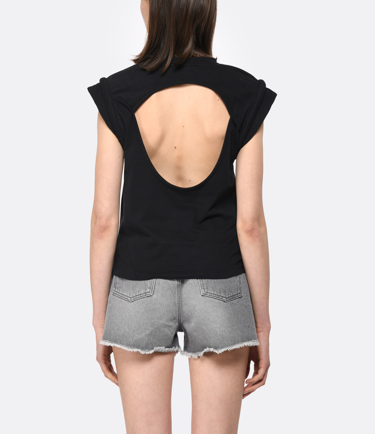 Tee-shirt en coton noir. Col rond. Ouverture arrondie dans le dos. Manches courtes avec détails de broderie au niveau des emmanchures. Coupe droite. Base droite.