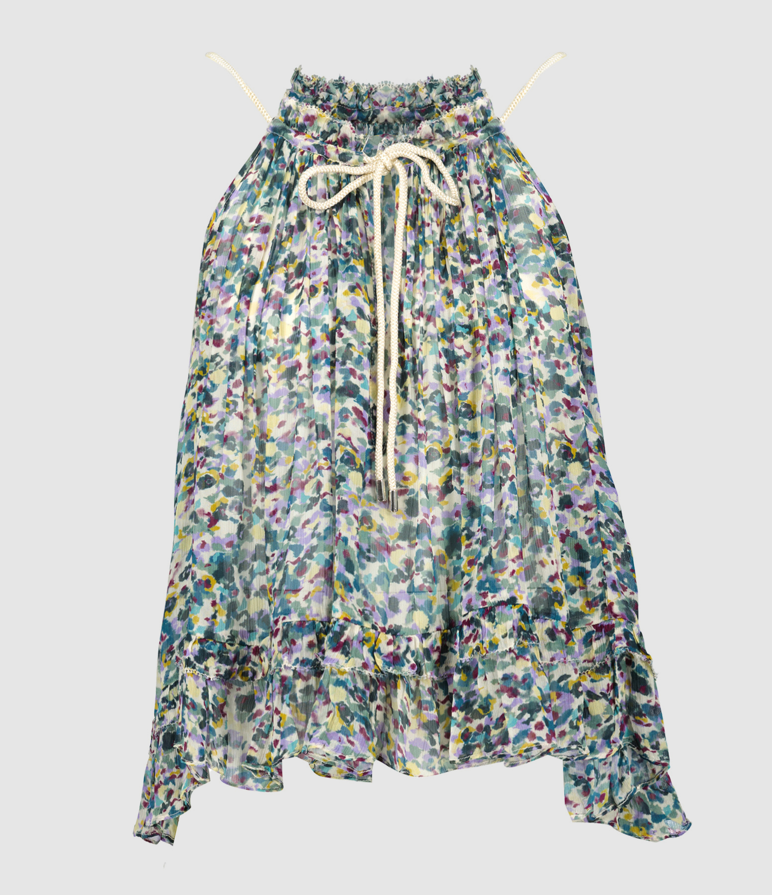 Top à imprimé dans des tons verts orné de fronces et de volants. Col montant à volants avec lien de serrage. Sans manches. Coupe ample. Base asymétrique volantée.