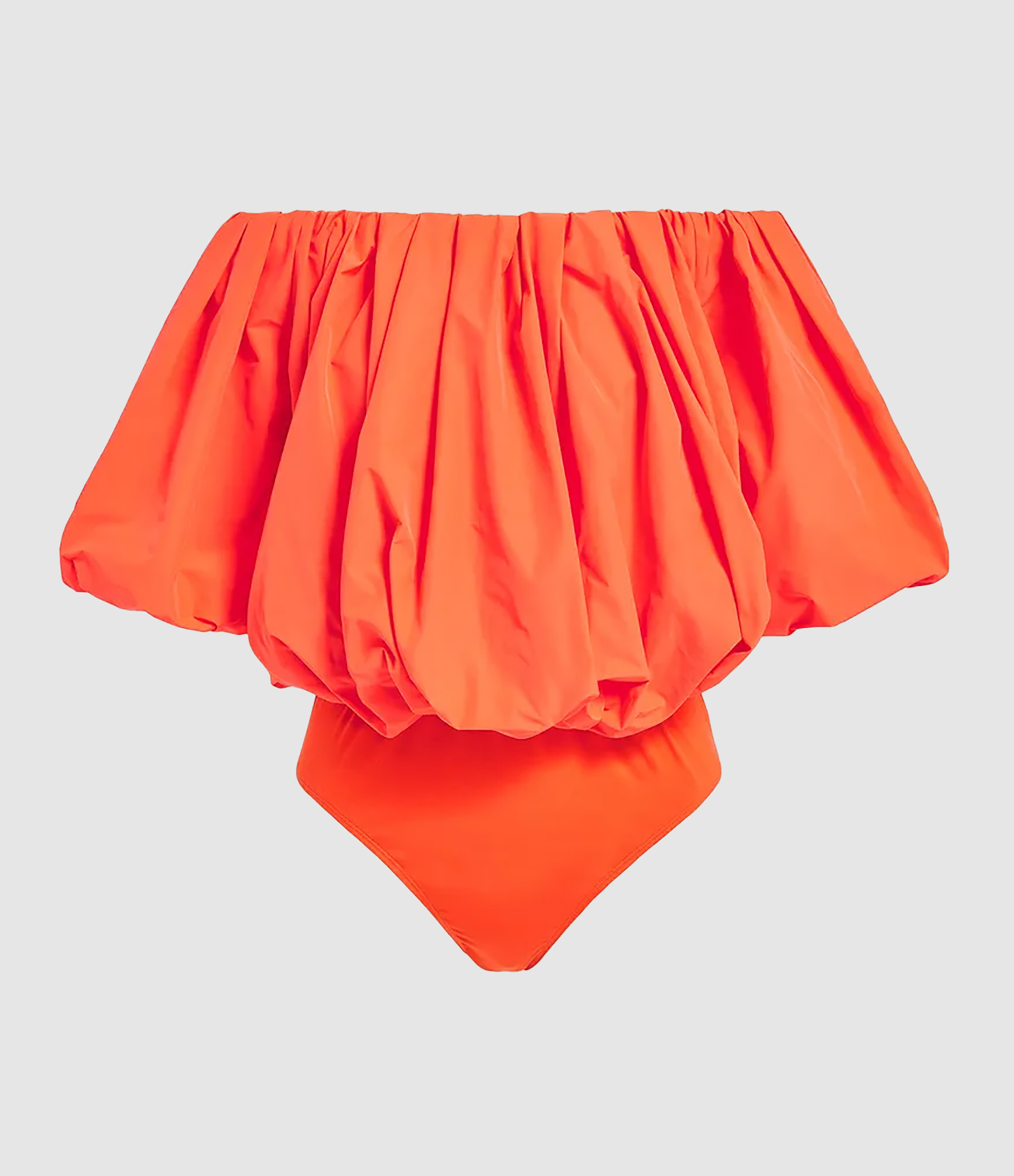 Body orange à fronces. Manches bouffantes 3/4. Col bardot élastiqué.