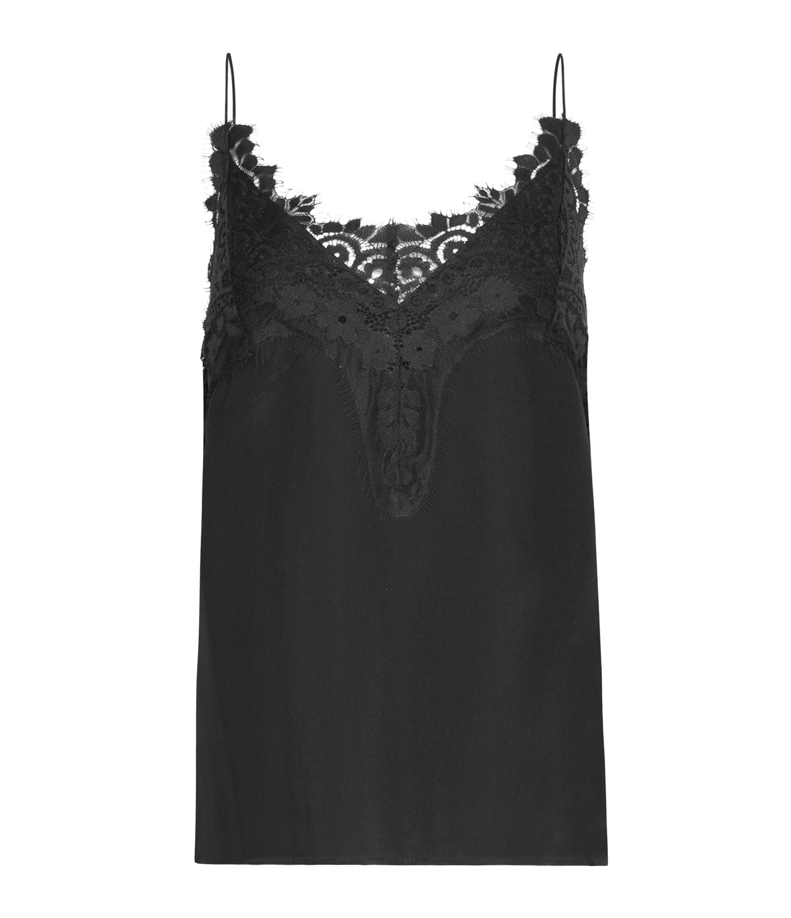 Top en soie et dentelle noir pour femme. Fines bretelles. Base droite. Coupe fluide et légèrement évasée. Doublé.