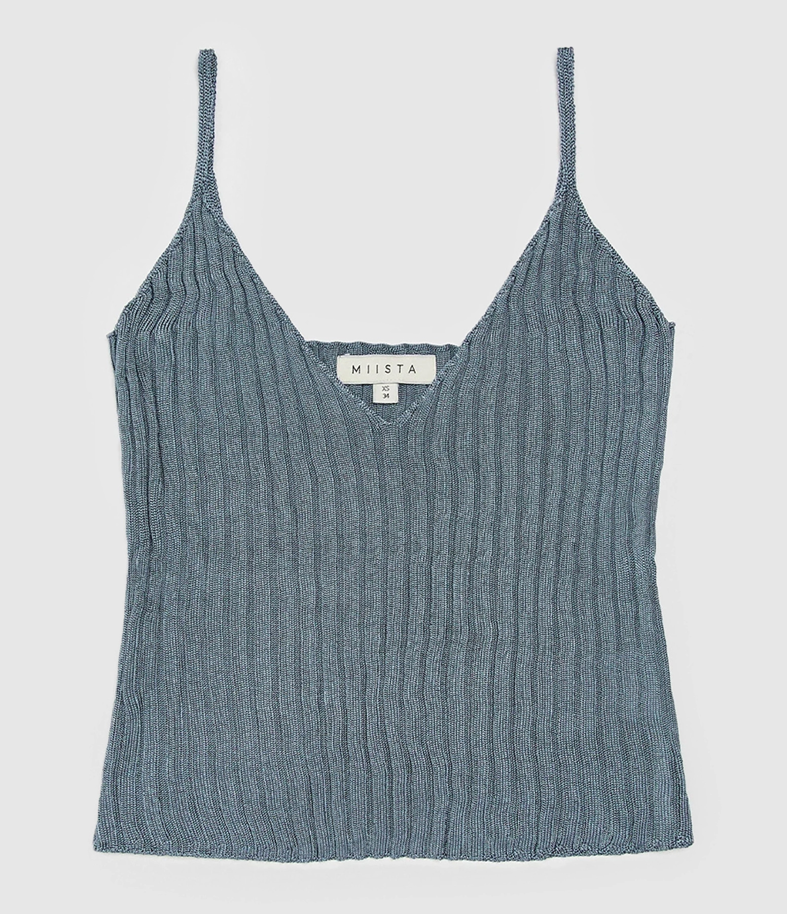 Top débardeur bleu côtelé. Col en V. Coupe droite et base droite.
