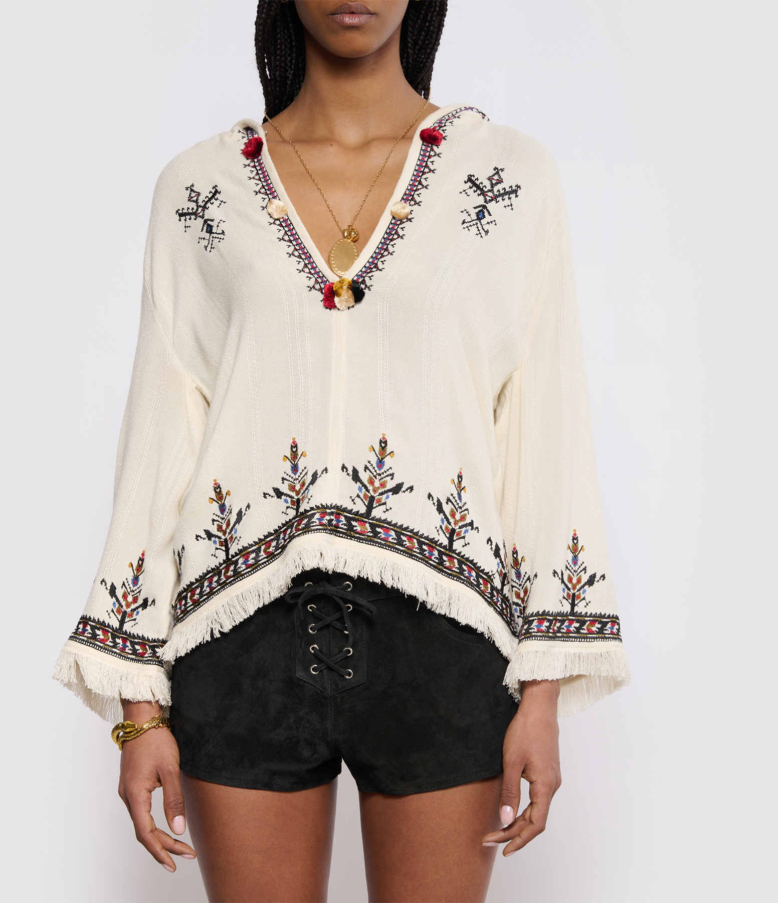 Top a capuche écru en viscose manches longues avec broderies colorées. Col rond avec des pompons beige noir et rouge. Coupe évasée et non doublé.