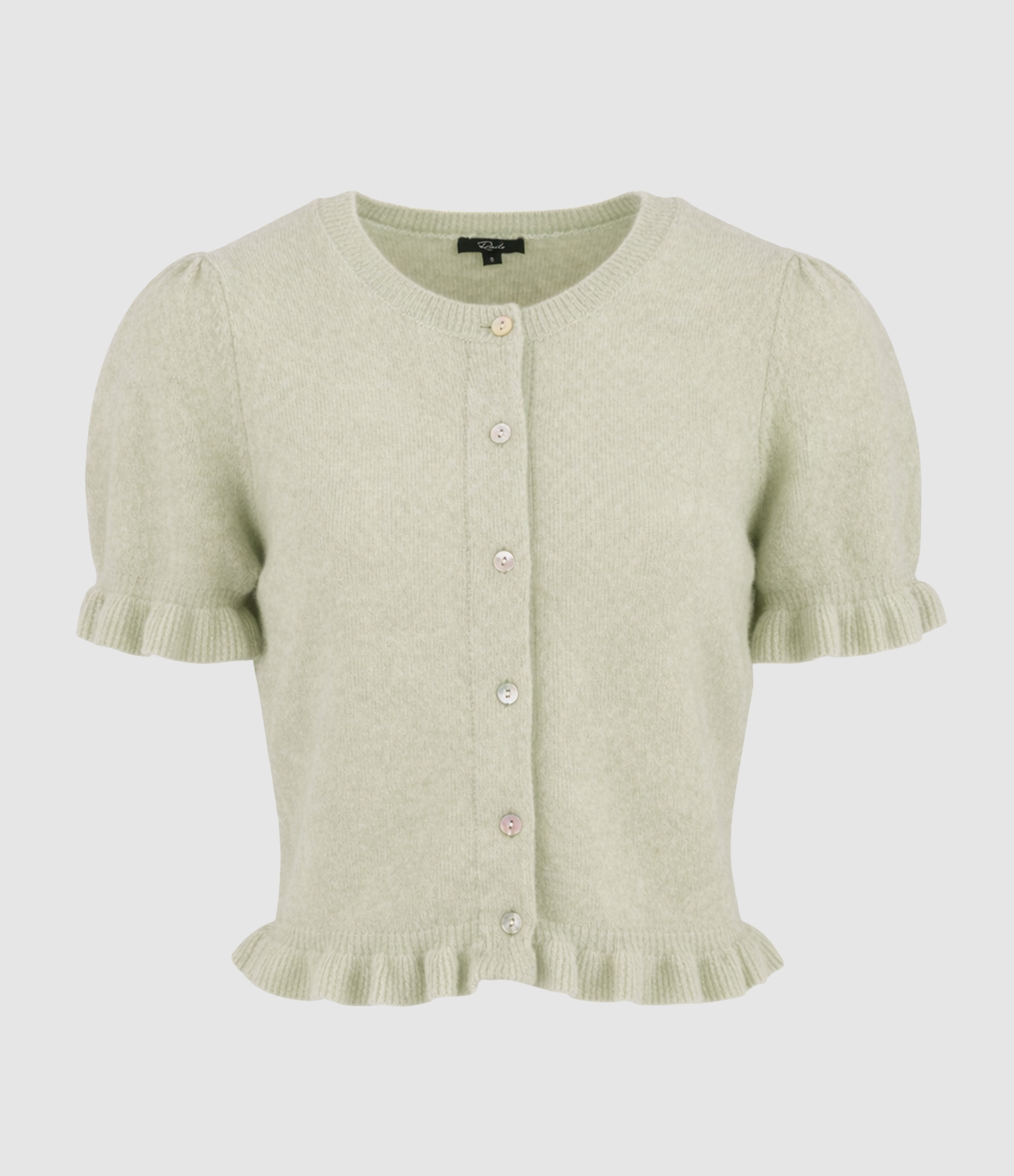 Confectionné dans un mélange de laine confortable, le cardigan à col rond Lora séduit par ses boutons sur le devant et ses manches bouffantes courtes et son ourlet ornés de volants.