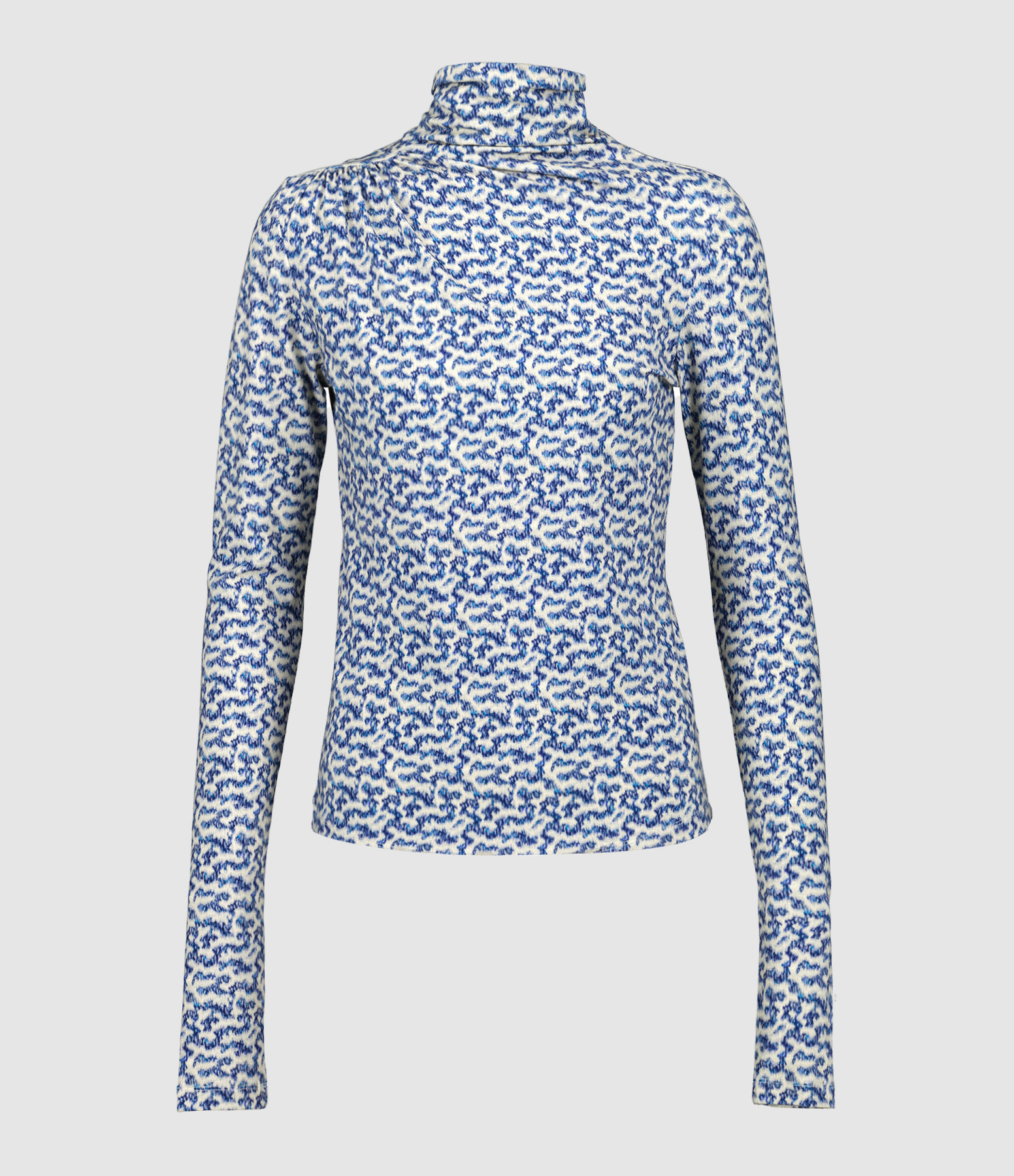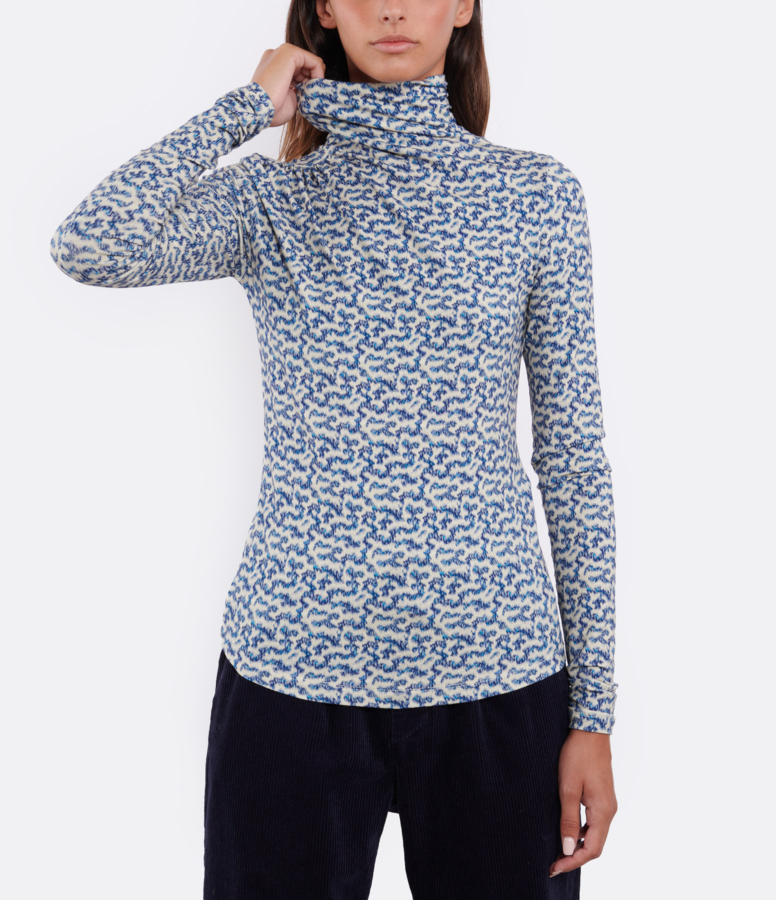 Top à imprimé bleu et blanc. Col roulé. Fronces aux épaules. Fermeture par zip invisible dans le dos. Manches longues. Coupe près du corps. Base arrondie.