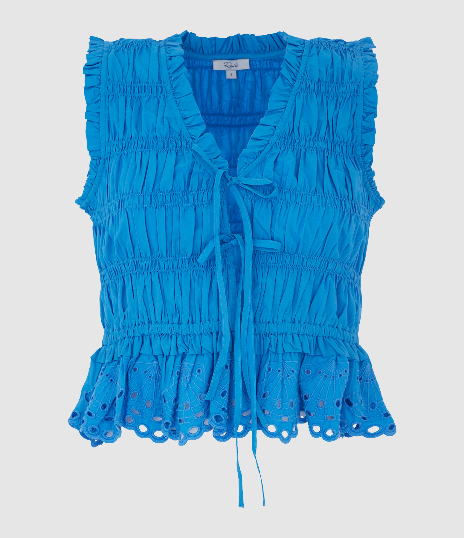 Confectionnée en popeline de coton épaisse, ce top présente des liens à nouer sur le devant et un ourlet à volants avec broderies sur le bas.