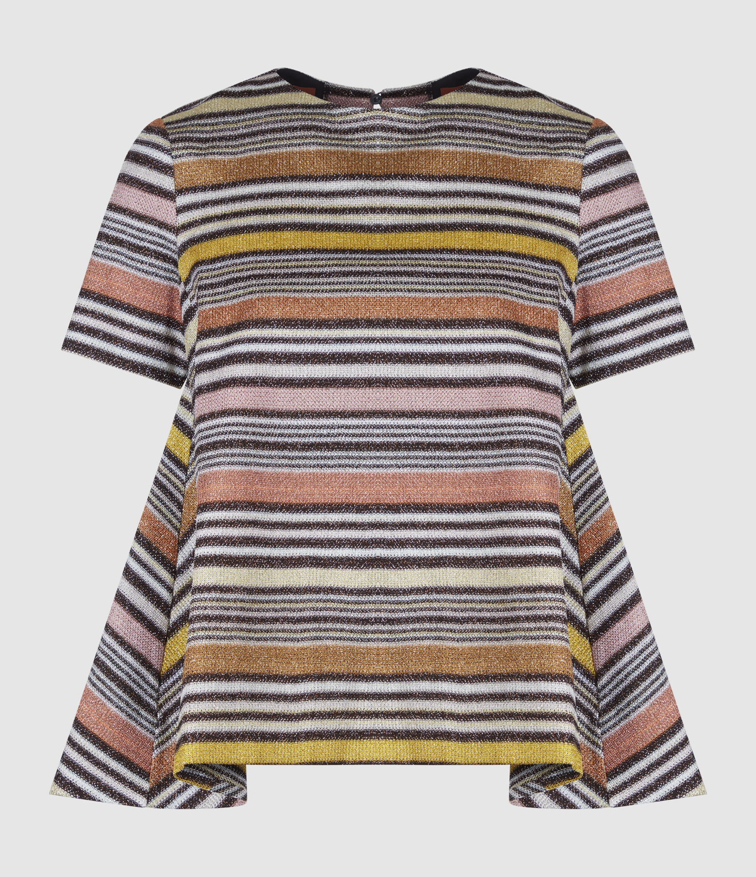 Haut à rayures multicolores avec paillettes. Doté de poches latérales, il se distingue par son dos ouvert.