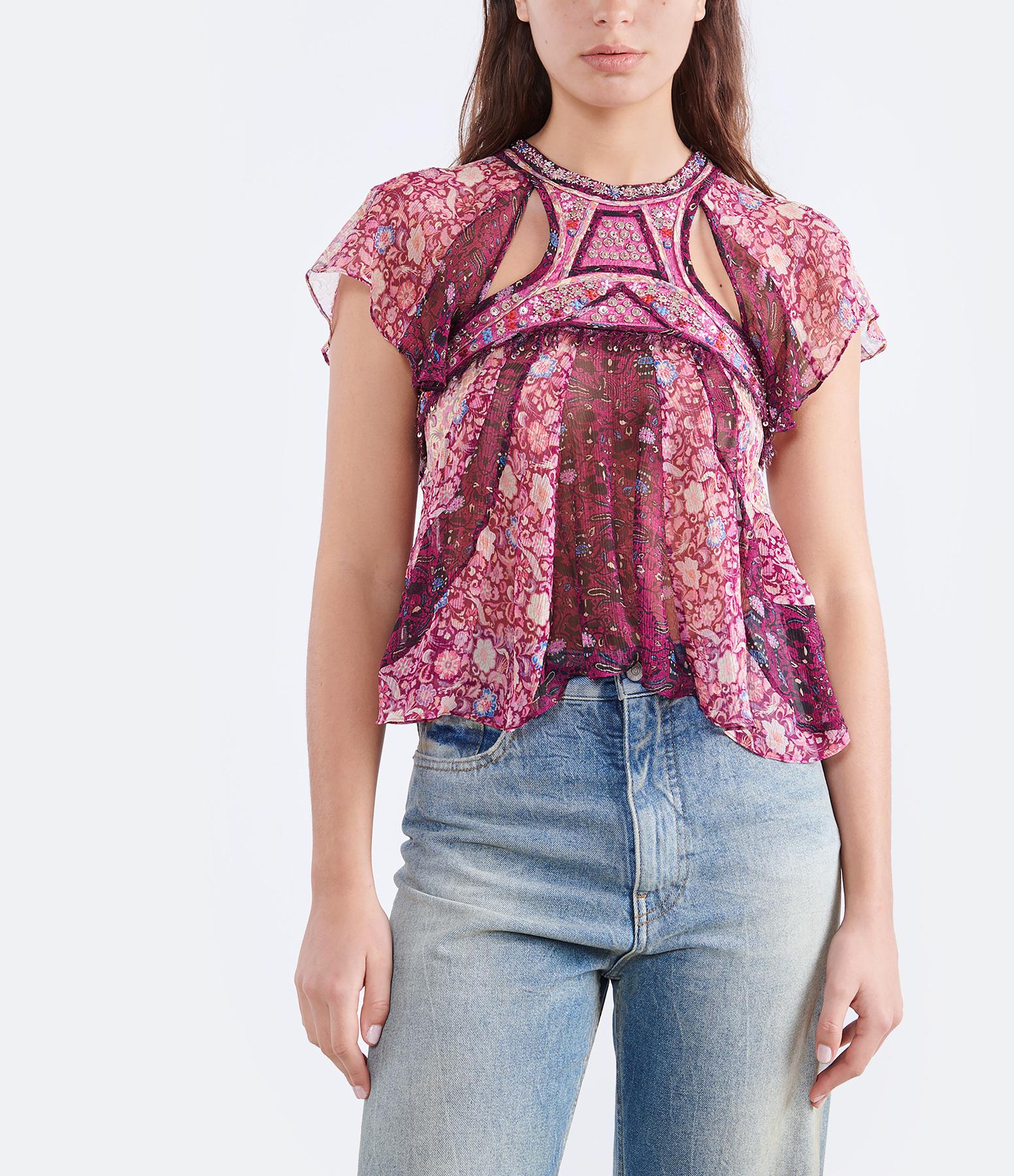Top violet à imprimé et sequins. Petite ouverture dans le dos. Effet de transparence. Manches courtes volantées. Col rond. Coupe droite. Base droite.