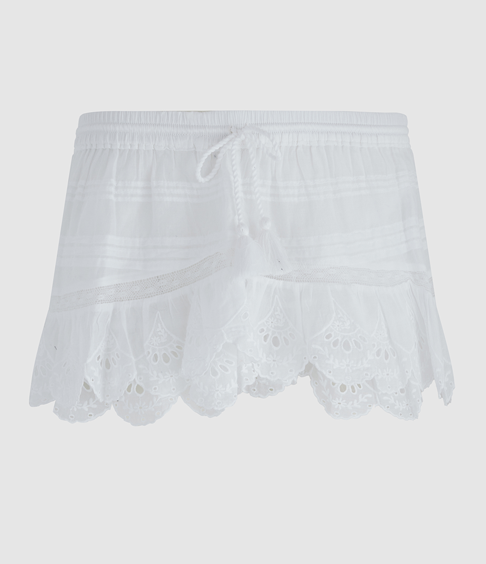 Haut façon caftan en coton organique et dentelle fleurie. Col rond avec cordons à nouer. Details de broderies anglaises. Manches courtes volantées. Jeu de volants et cordons latéraux. Coupe évasée.