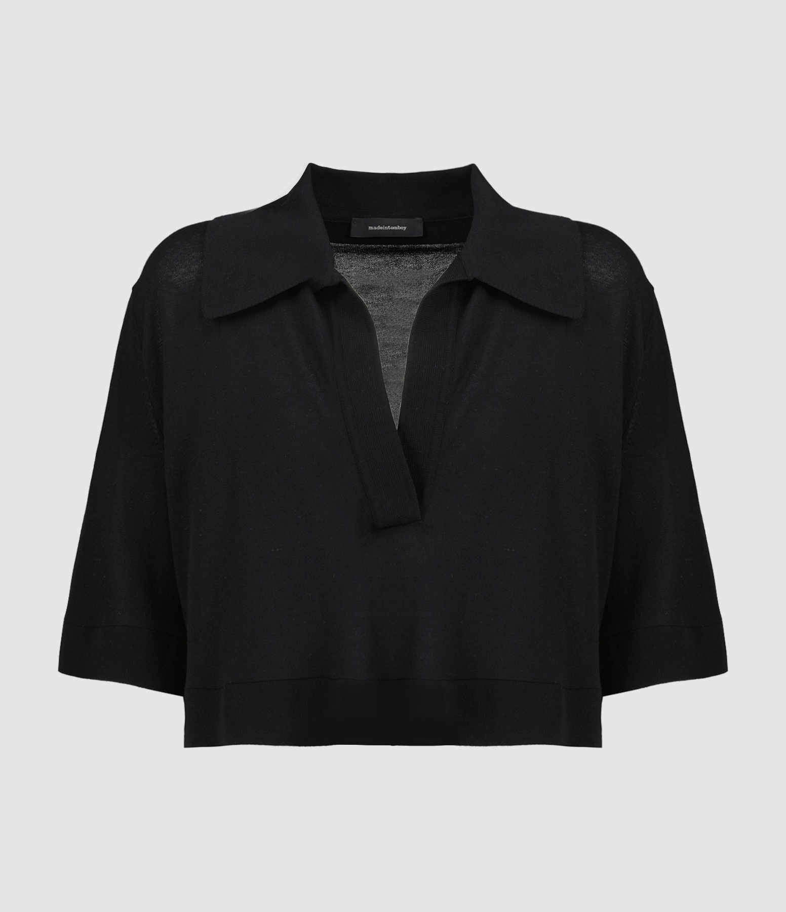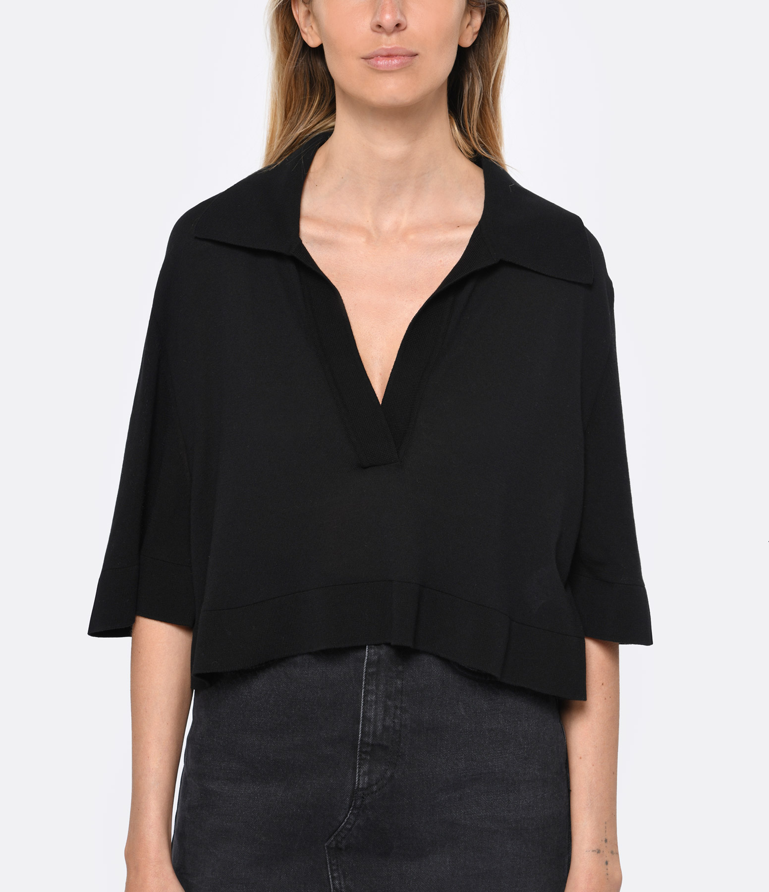Top court en coton noir. Col polo. Manches courtes. Coupe ample. Base droite.