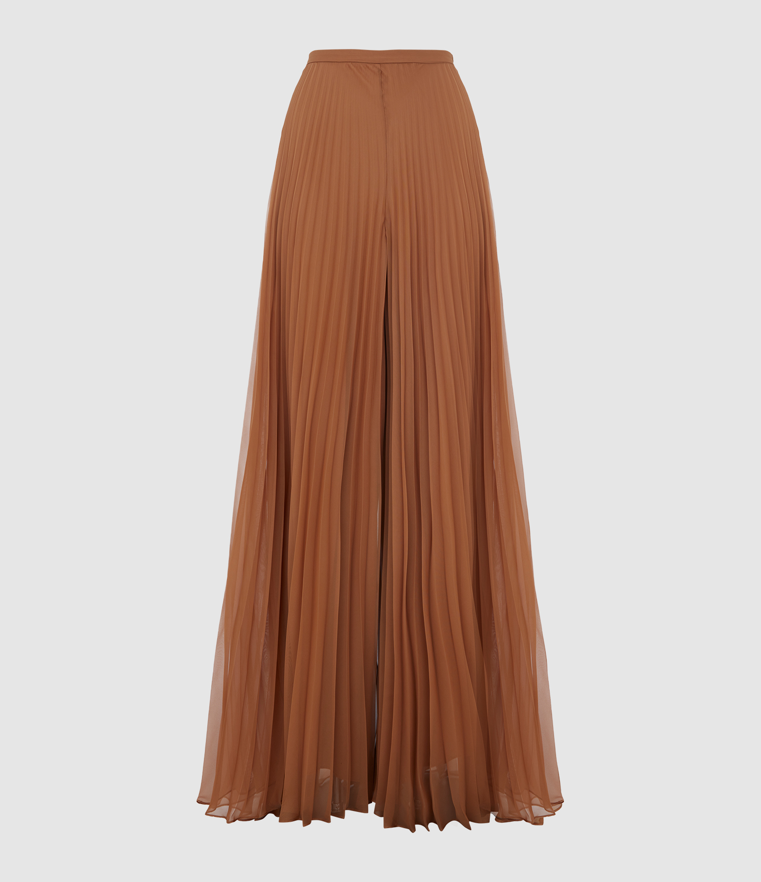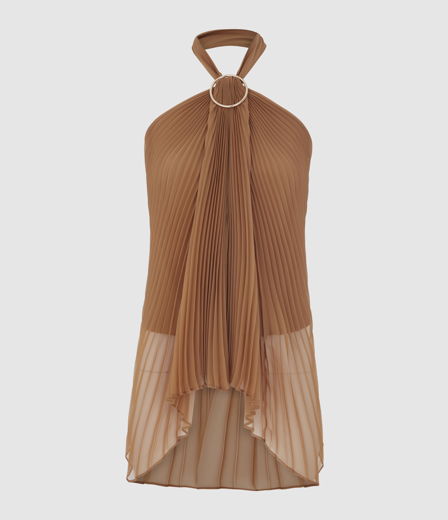 Haut évasé en mousseline, entièrement plissé, avec un bas asymétrique. Il présente une encolure américaine ornée d’une broche ronde en métal à l’avant et se ferme au dos par des rubans à nouer.