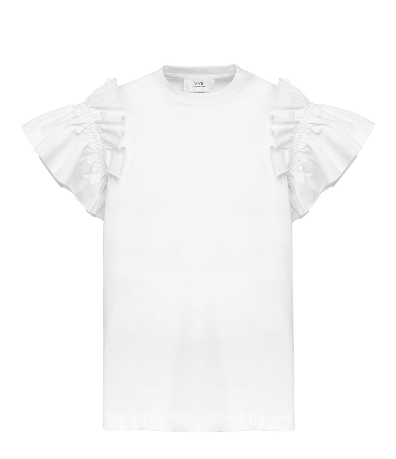 Top en coton blanc. Col rond. Manches courtes avec volants. Coupe droite. Base droite avec logo brodé.