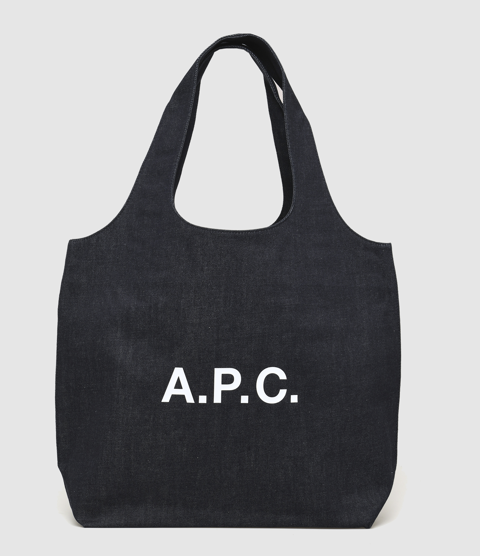 Sac cabas en jean. Logo A.P.C. blanc sur le devant. Deux anses supérieures. Un compartiment unique avec poche plaquée. Surpiqûres ton sur ton.