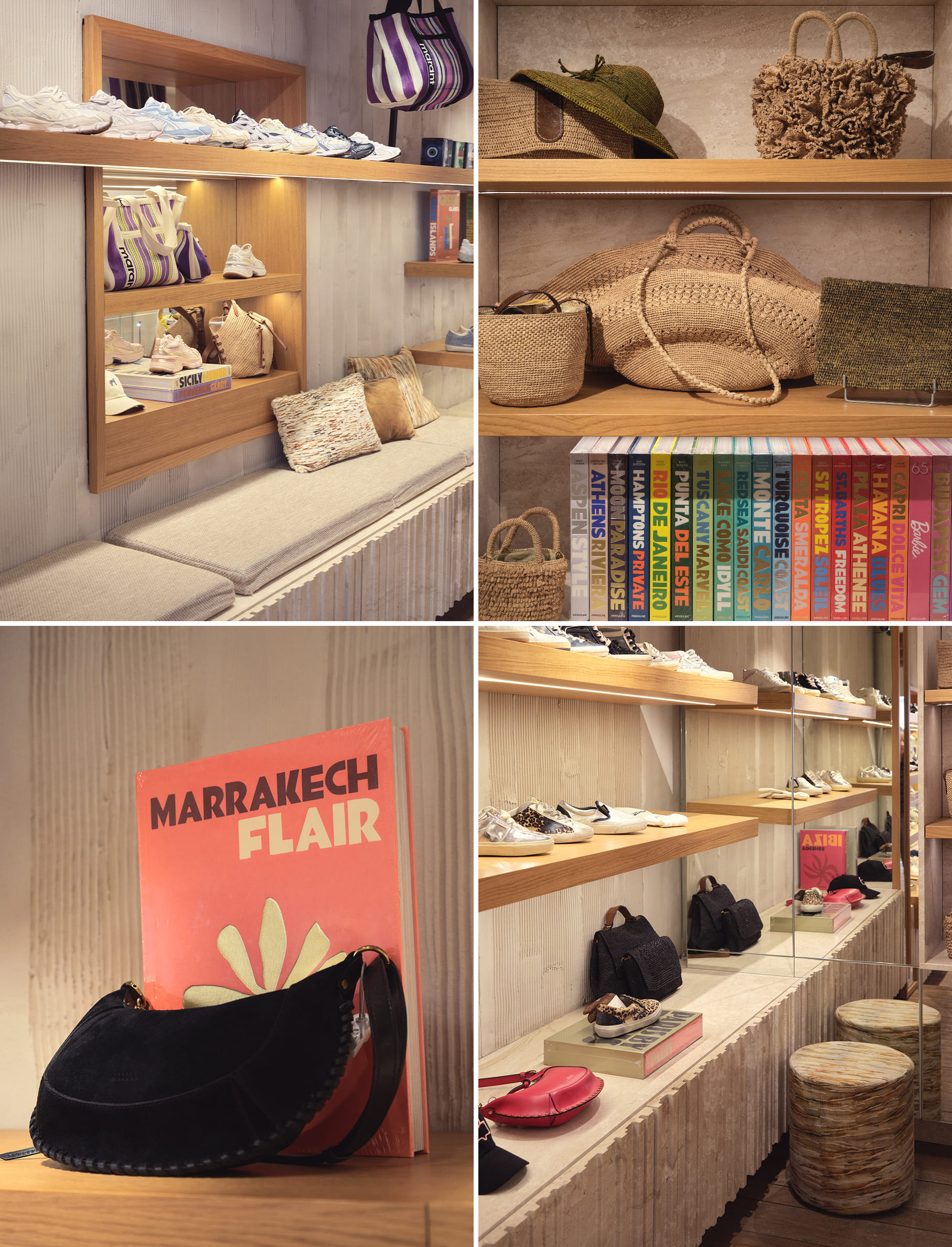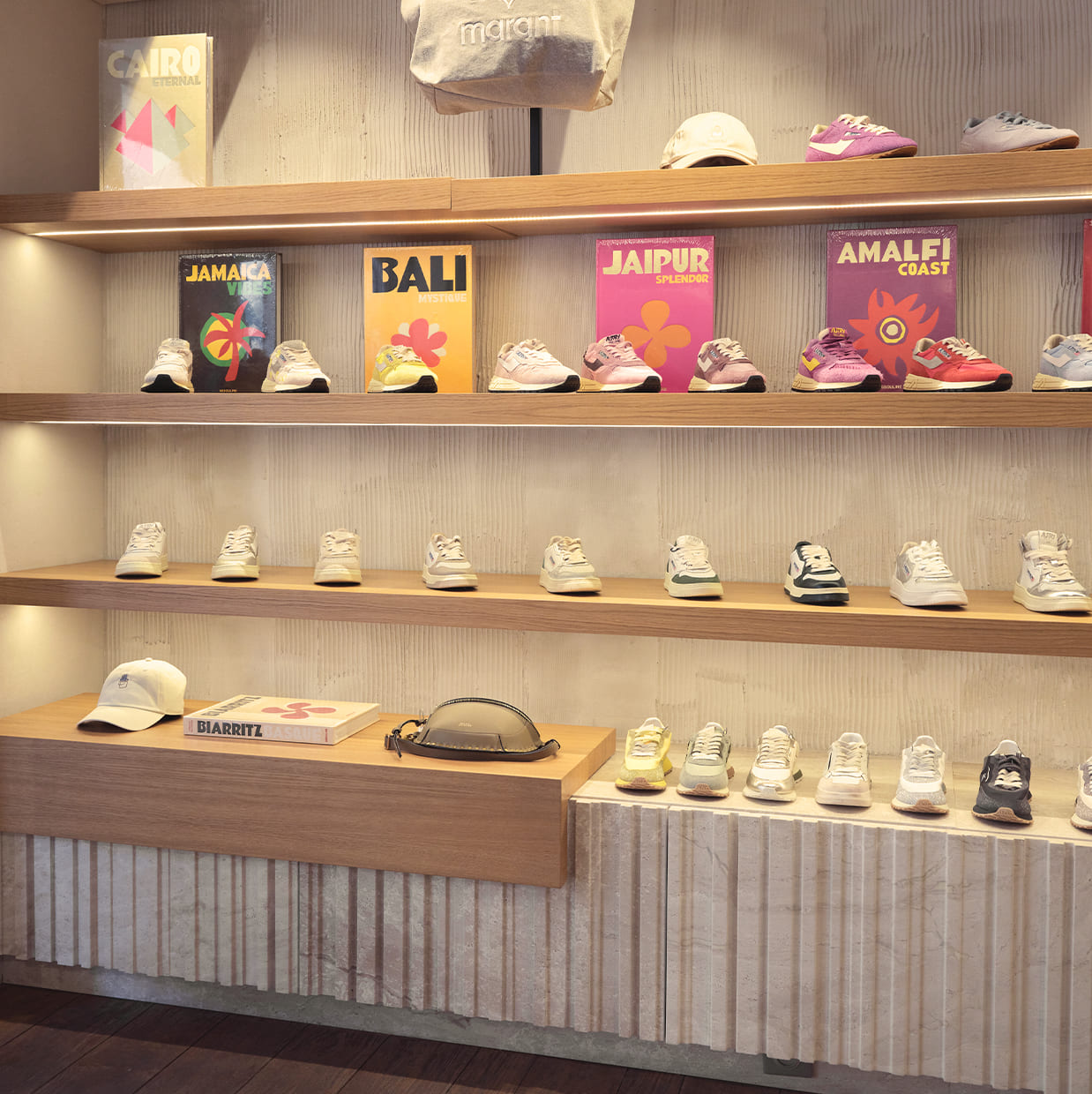 Encore plus intimiste, l’espace se pare de blancs lumineux, de bois clair et de poutres apparentes qui structurent le regard et magnifient les collections. Sacs, chaussures, baskets, livres, s’y exposent comme des essentiels évidents. Une sélection affûtée pour twister une silhouette, finaliser un look, ou se faire plaisir, tout simplement !