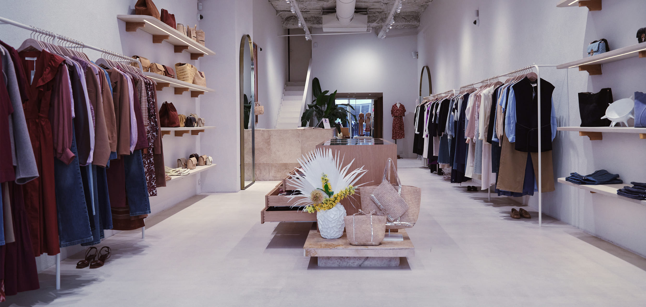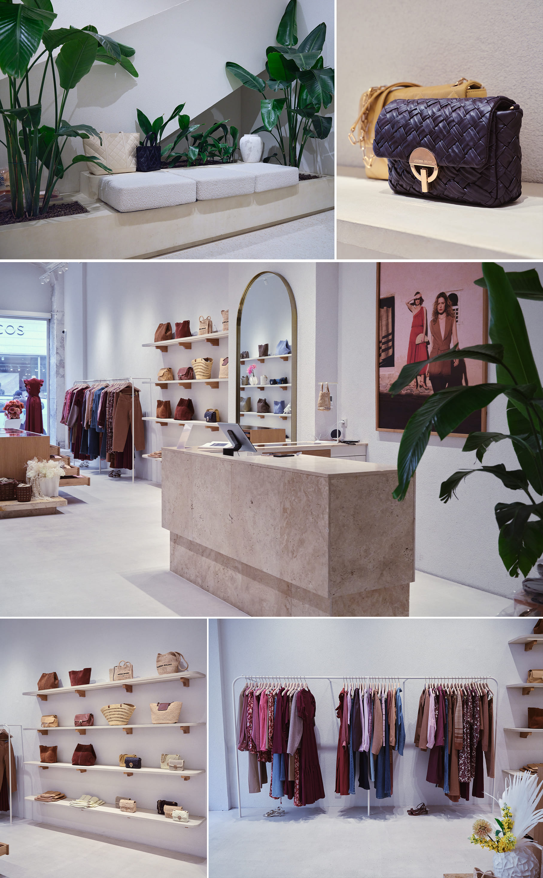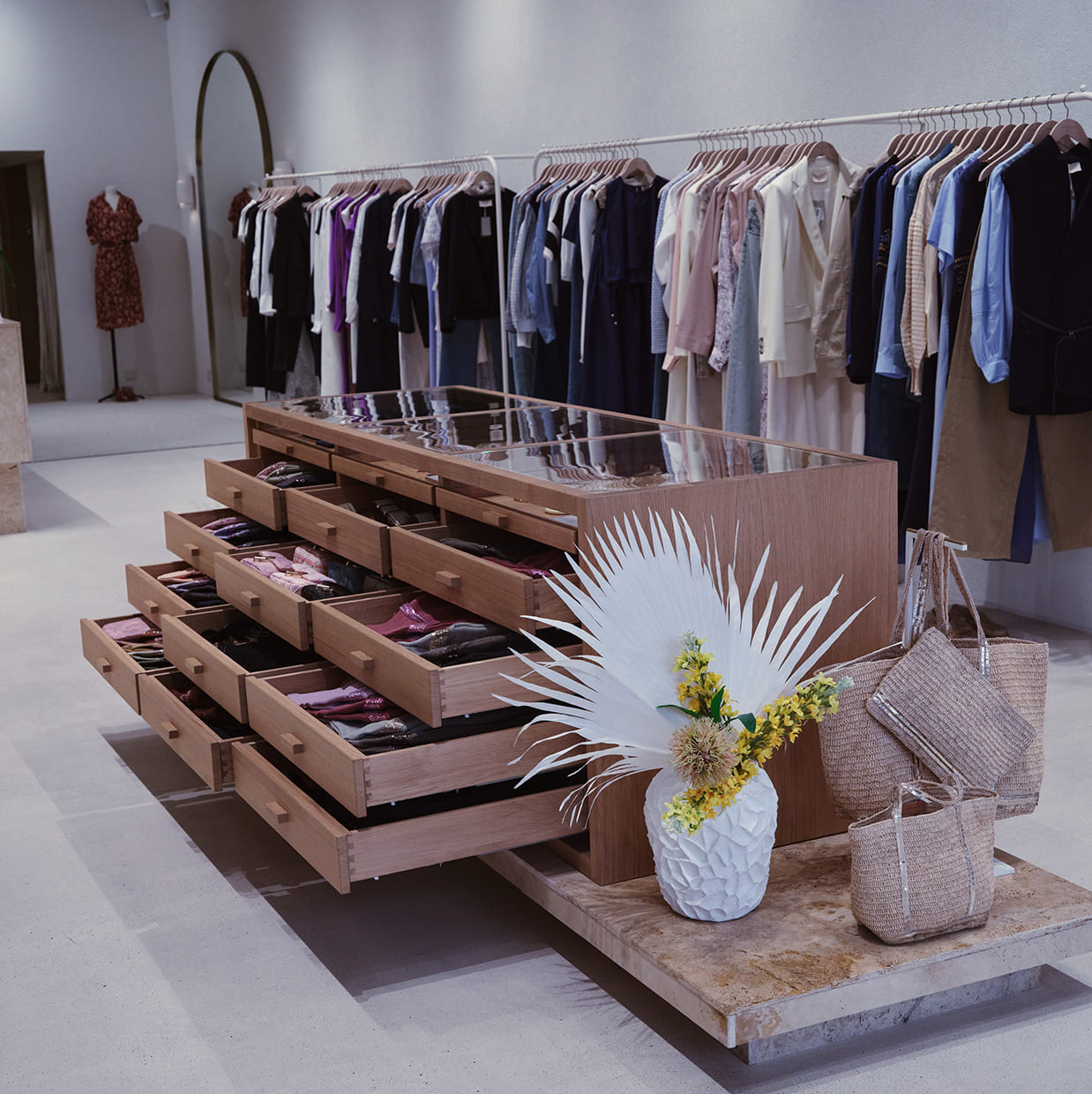 Un espace lumineux, apaisant, aux lignes sobres. Teintes claires, plantes confortantes, matières naturelles : tout est pensé pour laisser respirer les collections. Les volumes invitent à prendre le temps, à circuler librement, à essayer, à revenir. Une boutique à l’esthétique intemporelle, où le décor accompagne chaque création de la créatrice parisienne.