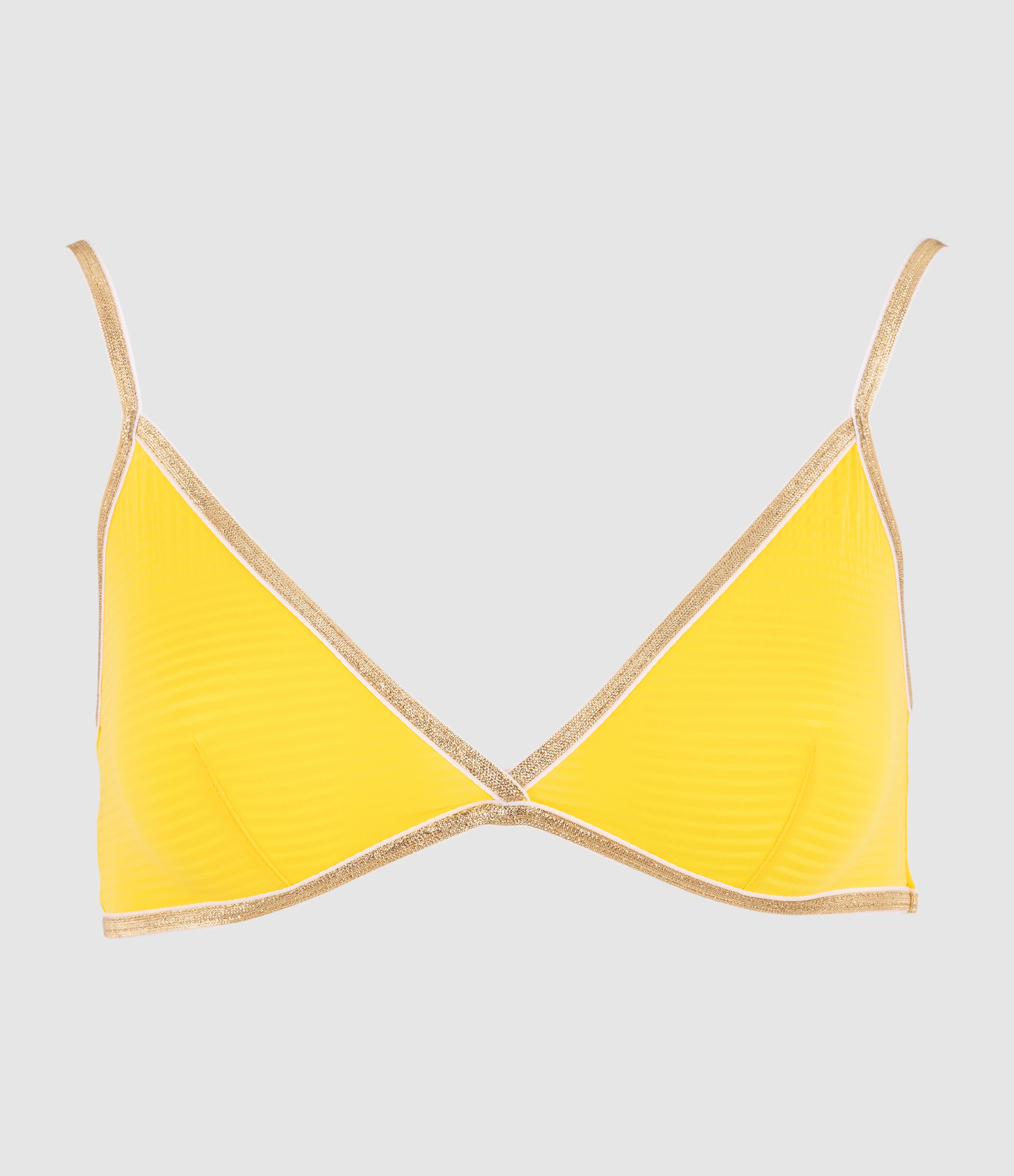 Soutien-gorge triangle jaune, sans armatures. Fronce sur l'avant. Bretelles réglables croisée dans le dos. Entièrement élastiqué pour assurer un maximum de confort.