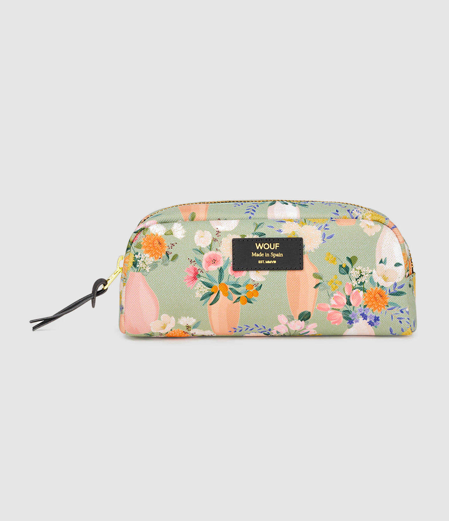 Petite trousse arrondie en toile recyclée, imprimé bouquets pastels. Fermeture glissière YKK recyclée. Résistante à l'eau. Encres écologiques.