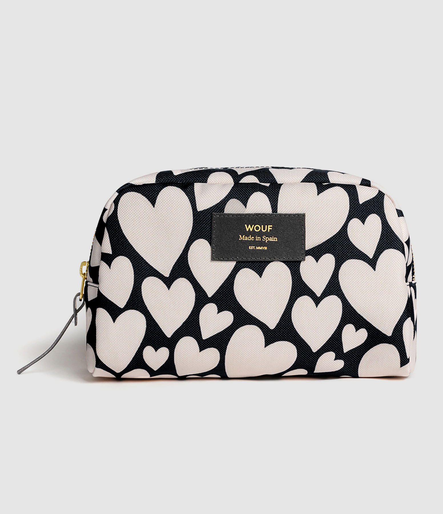 Trousse arrondie en toile recyclée, imprimé cœurs noirs et blancs. Fermeture glissière YKK recyclée. Résistante à l'eau. Encres écologiques.